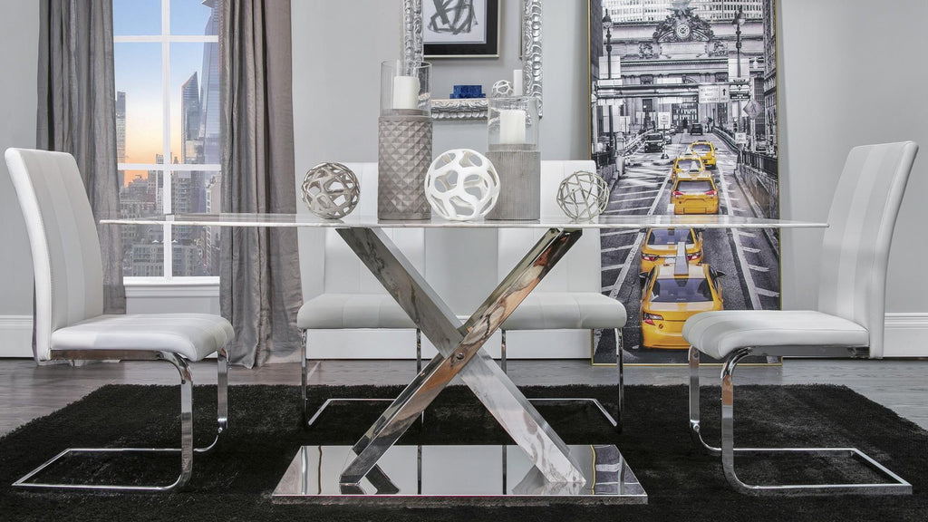 Get all the look of elegant Carrara marble with this stunning yet practical glass-top dining table. Design elements include an x-base design with polished stainless steel accents. This table offers plenty of space for all of your entertaining needs.