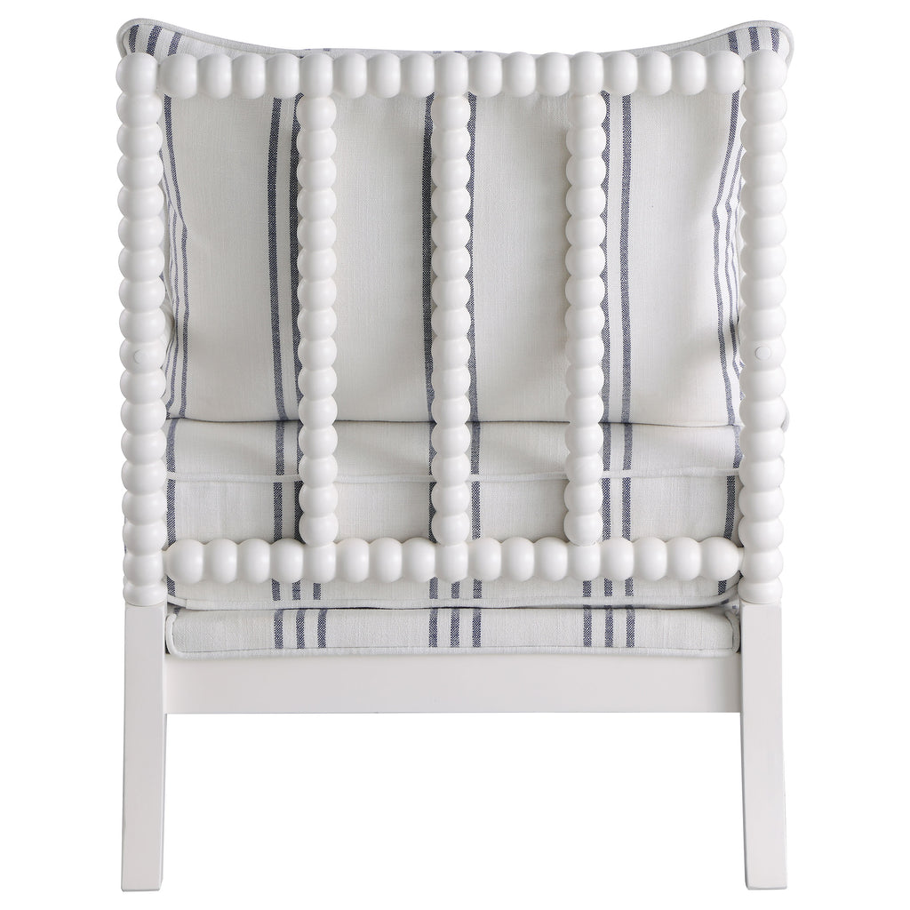 Light and bright as can be, this contemporary accent chair offers a cheerful look to any space. This accent chair offers comfortable seating with each cushion wrapped in a white linen-like upholstery accented with navy awning stripes. With a sharply designed frame that includes decorative spindle back posts, legs and armrests, all in bright white finish, this accent chair lends a subtle boho style. In addition, this accent chair offers extra details such as padded armrests and welt trim. Place this nautical-inspired accent chair on a covered veranda or a sunroom for a crisp, clean look. Key Features: • Brighten your décor with a matched awning stripe accent chair • Stylishly framed with white decorative spindle back posts, legs and armrests • Sinuous spring and pocket coil seat construction for lasting comfort • Reversible back cushion for added support • Constructed with solid hardwood, rubberwood, and fabric