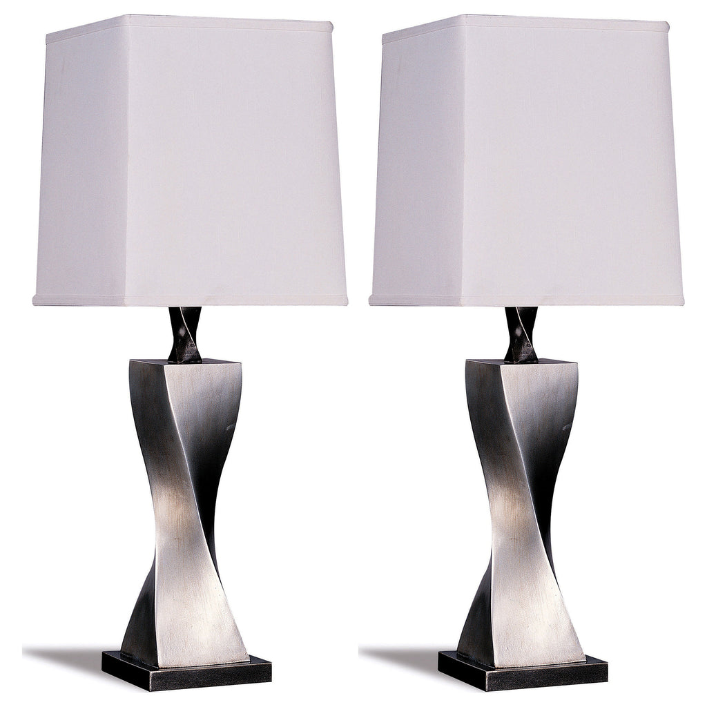 This distinctive table lamp set makes a sculptural statement with twisted metal bases and square tapered shades. The brushed silver finish enhances the fluid form, adding movement and depth to the contemporary profile. Each lamp is grounded by a matte black pedestal base for contrast and stability. Perfect for bedrooms, living rooms, or offices, this matching set delivers balance, symmetry, and visual intrigue to any modern interior. Key Features: • Table lamp set features two modern lamps with sculptural twisted metal bases • Brushed silver finish brings dimensional shine and contemporary flair • Square tapered shade offers angular contrast and diffused lighting • Matte black base provides sturdy foundation and sharp color contrast • Crafted from heavy gauge metal for lasting durability and style • Ideal for modern bedrooms, living rooms, or home office environments