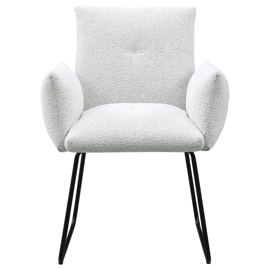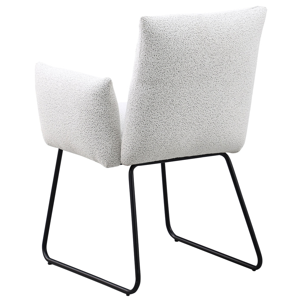 Elevate your dining experience with this modern dining chair, designed for both comfort and style. Upholstered in soft fabric, this chair provides a cozy seat for everyday dining or special gatherings. The chair features a contemporary design with gently curved armrests and a sleek, powder-coated black metal sled base for a minimalist yet bold look. Its clean lines and subtle elegance make it a perfect addition to any modern dining room or kitchen space. Key Features: • Modern dining chair upholstered in soft light grey fabric for comfort and elegance • Gently curved armrests provide extra support for a relaxed seating experience • Sleek powder-coated black metal sled base adds durability and a contemporary touch • Versatile design works well in both dining and casual seating areas • Minimalist aesthetic that blends seamlessly into any modern dining space