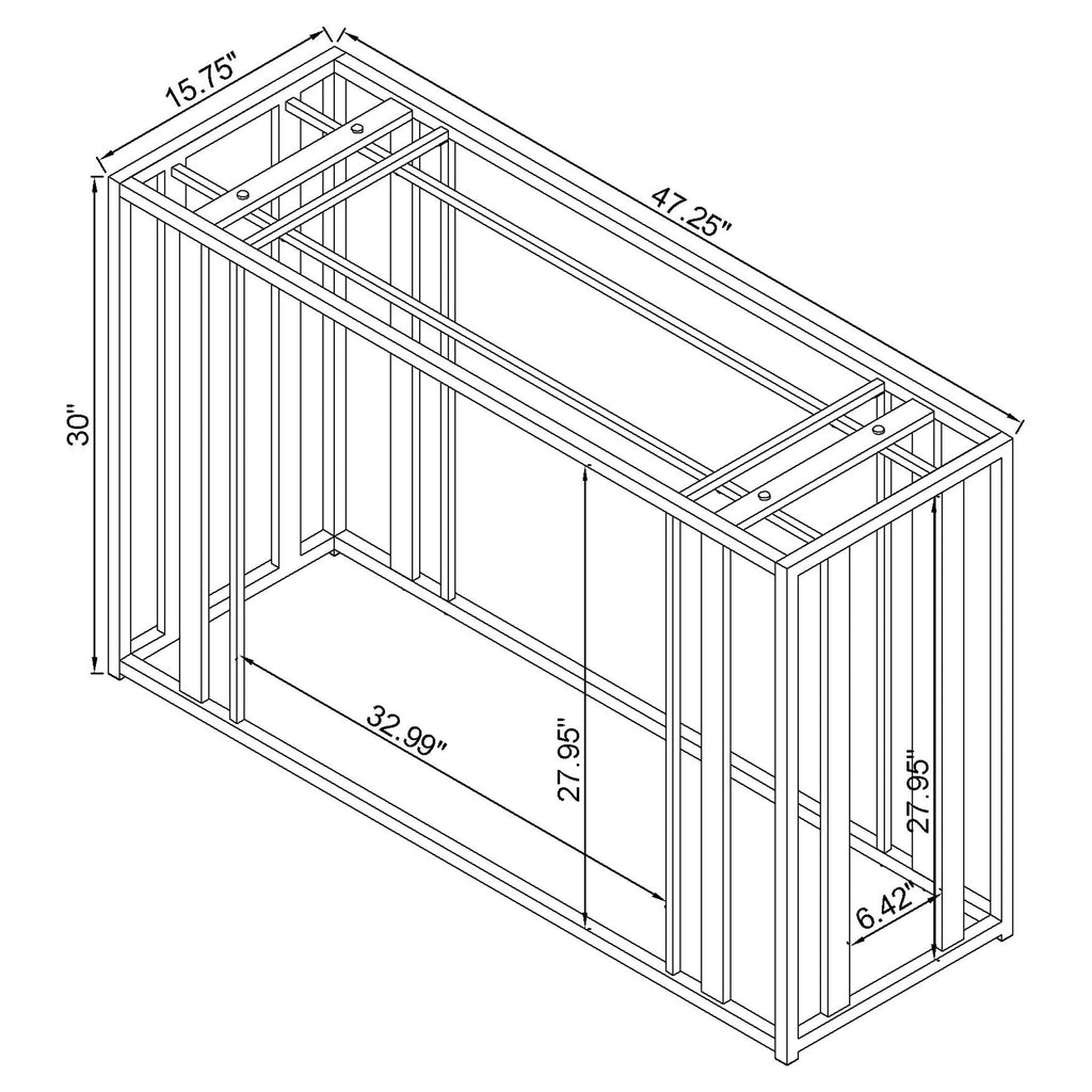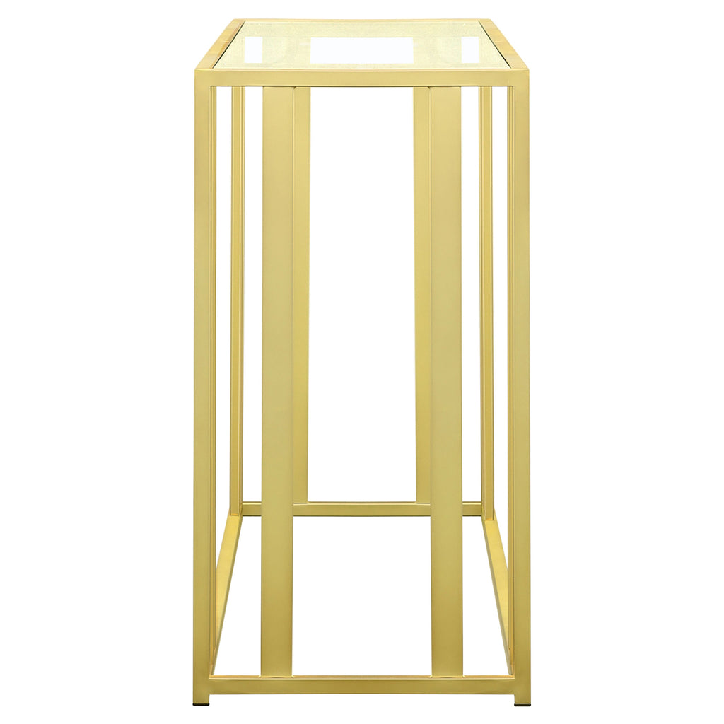 This modern rectangular console table features a clear tempered glass top paired with a geometric base crafted from heavy-gauge metal with a sleek electroplated finish. The open design creates a contemporary aesthetic, offering both elegance and durability. Ideal for placement in entryways, hallways, or behind sofas, this console table provides a spacious surface for displaying decor or organizing essentials. Its scratch-resistant materials ensure long-lasting quality with easy maintenance.