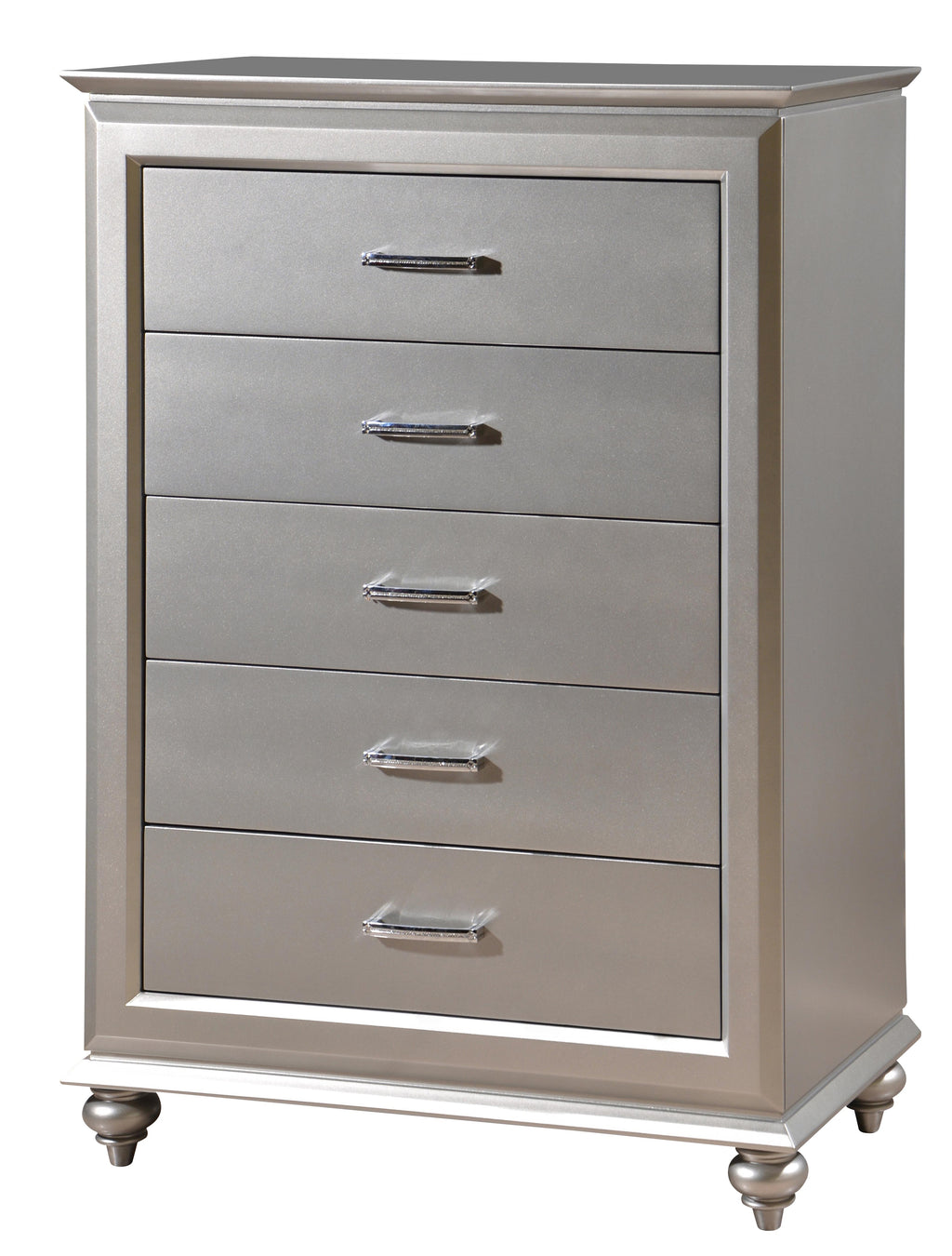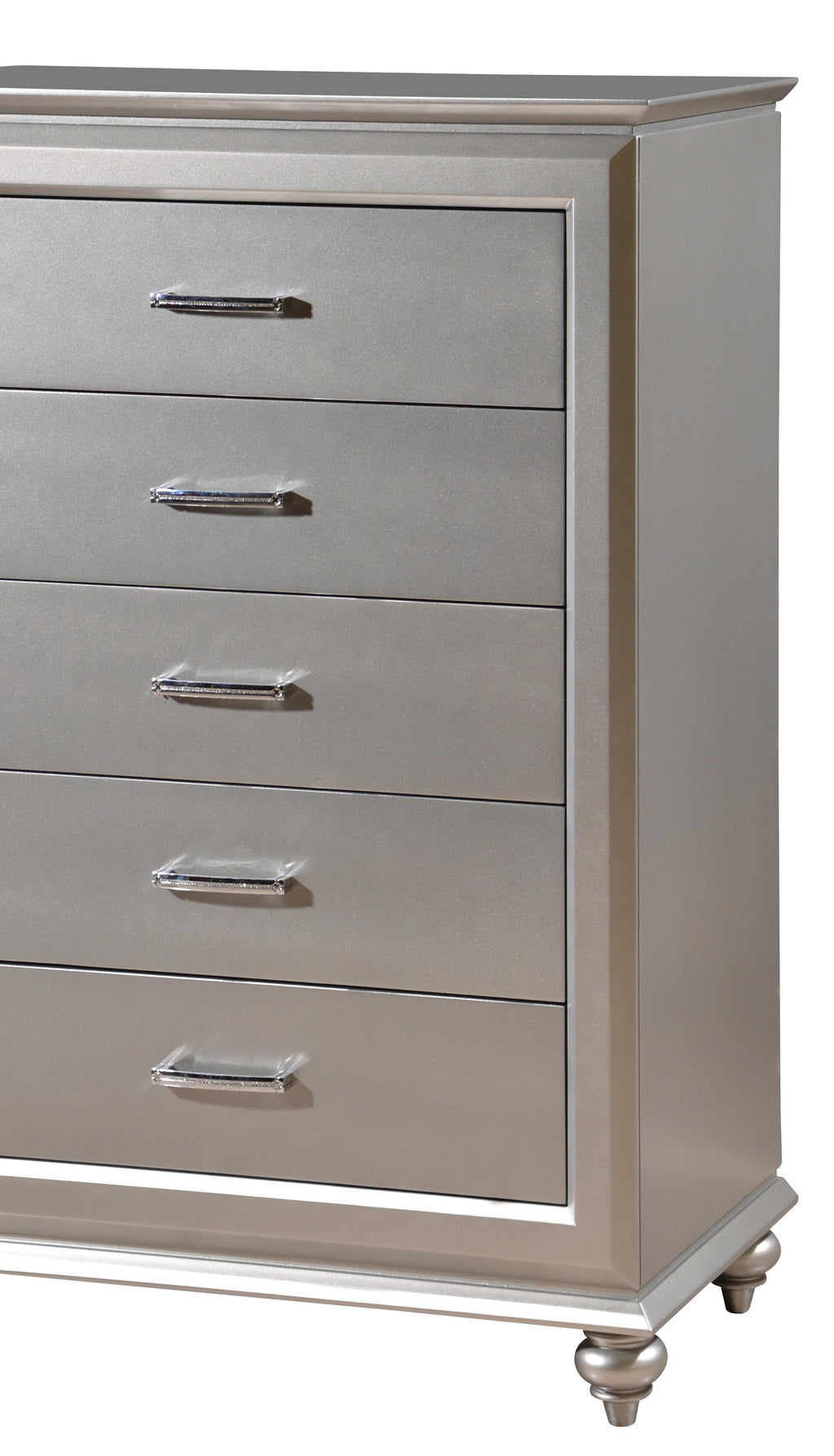 Cosmos Furniture's Alia modern style Chest in gray finish wood brings the simplicity to life with straight line. The deep Five (5) drawers Chest has dovetail construction with full extension glides. The wood box drawers have nickel with faux crystal hardware to enhance the sophisticated look. The bottom drawers are dust proof. The Chest features detailed turned legs, base and sides. Matching more bedroom pieces are sold separately to complete the entire look of your excellent taste.
