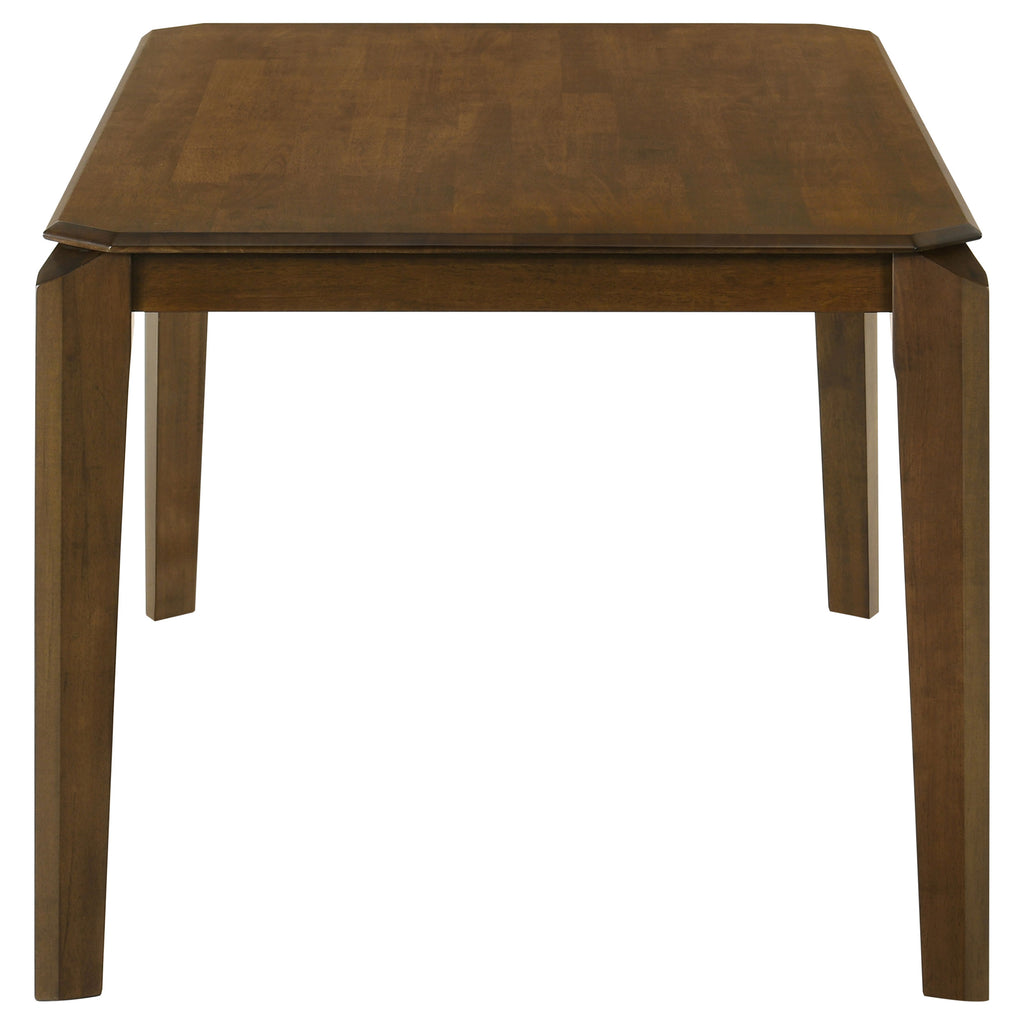 Center your stylish dining room on the angular silhouette of a modern rectangular dining table. Perfect for family gatherings and daily meals, it boasts a dark brown wood finish over rubberwood, delivering excellent style and durability. The rectangular table featured a chamfered edge that augments the flared design and almost faceted look of its four support legs. The legs protrude beyond the tabletop, while a recessed apron completes the look with familiarity. The table comfortably seats four to six, perfect for your breakfast nook or dining room. Key Features: • Artisan details enhance the eye-catching look of a modern rectangular dining table • Dark brown finishing highlights wood grain details and offers rich, refined character • Gently tapered, slightly flared legs with an angular look and feel create engaging visual depth • Table edge features a 45-degree chamfered design that adds angular flair to match legs • Made from rubberwood for excellent quality, durability, and a refined look and feel