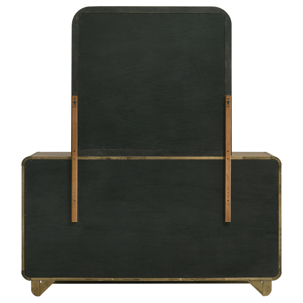 This dresser and mirror set combines modern design with practical storage, creating a complete and stylish solution for your bedroom. The six-drawer dresser, finished in a warm nutmeg wood tone, offers ample space for your wardrobe essentials, while the matching mirror enhances the room with light and depth. Metal extension glides ensure that the drawers open smoothly, providing easy access to your belongings. The rounded corners and matte nickel hardware add contemporary flair to both pieces, making them a perfect match for any modern bedroom. Crafted from solid rubberwood, this set is built to last. Key Features: • Six-drawer dresser with coordinating mirror for a complete look • Nutmeg wood finish enhances the modern aesthetic • Metal extension glides ensure smooth drawer access • Rounded corners and matte nickel hardware add modern style • Crafted from solid rubberwood and engineered wood for durability