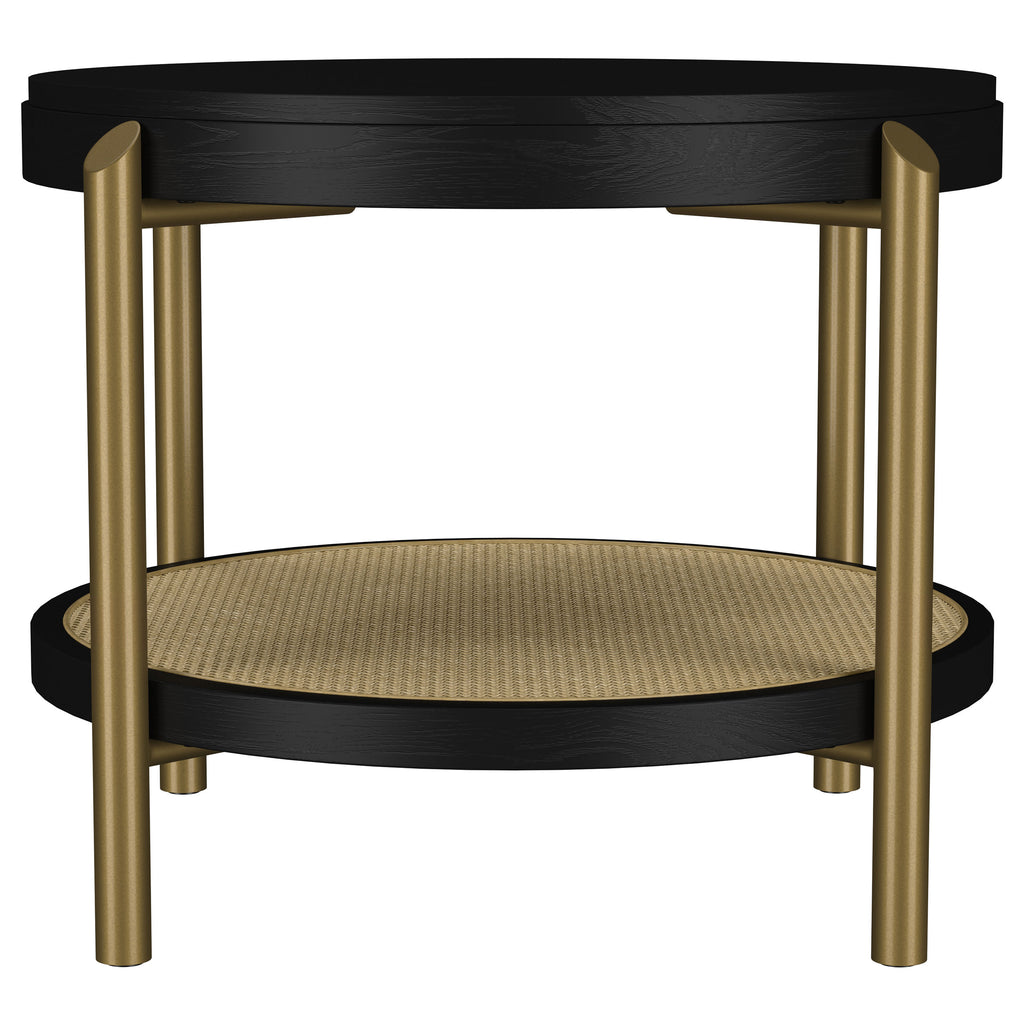This coffee table set blends modern design with rustic elements, making it a stylish and functional addition to any space. Crafted from Asian hardwood, engineered wood, and ash veneer, the smooth finish highlights the natural wood grain for an organic aesthetic. Each piece features a woven rattan lower shelf for added storage and texture. Sturdy aged brass-finished metal legs provide lasting support while complementing the rustic tones. Designed for versatility, this occasional table set enhances both contemporary and classic interiors.