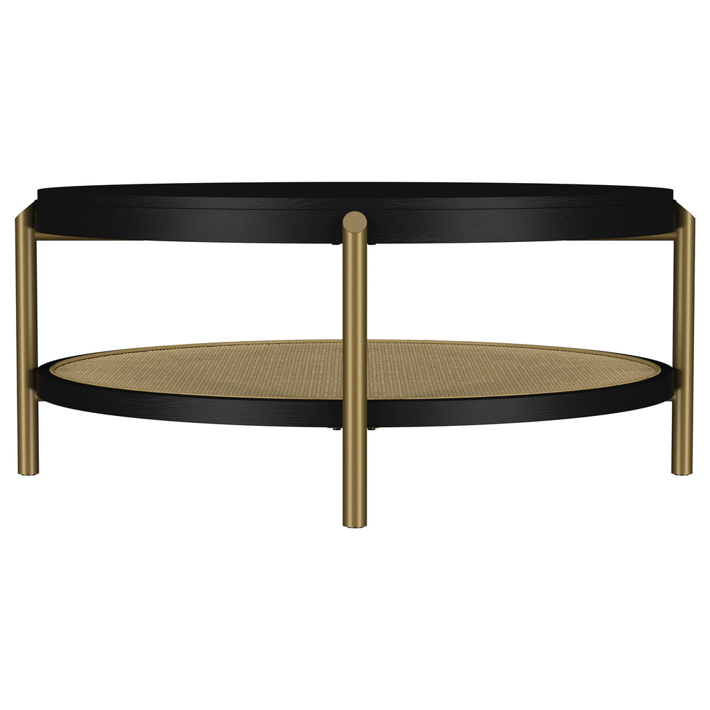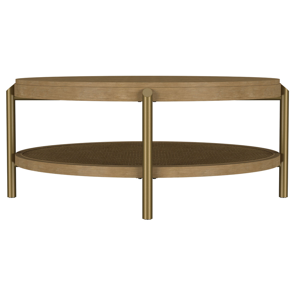 This round coffee table combines modern design with rustic charm, perfect for today’s living spaces. Crafted with Asian hardwood, engineered wood, and ash veneer, its smooth finish highlights the natural wood grain for an organic appeal. The lower shelf features woven rattan, offering practical storage and a textured look. Supported by aged brass-finished metal legs, this cocktail table delivers a balance of durability and style, serving as a functional centerpiece for any living room or lounge area.