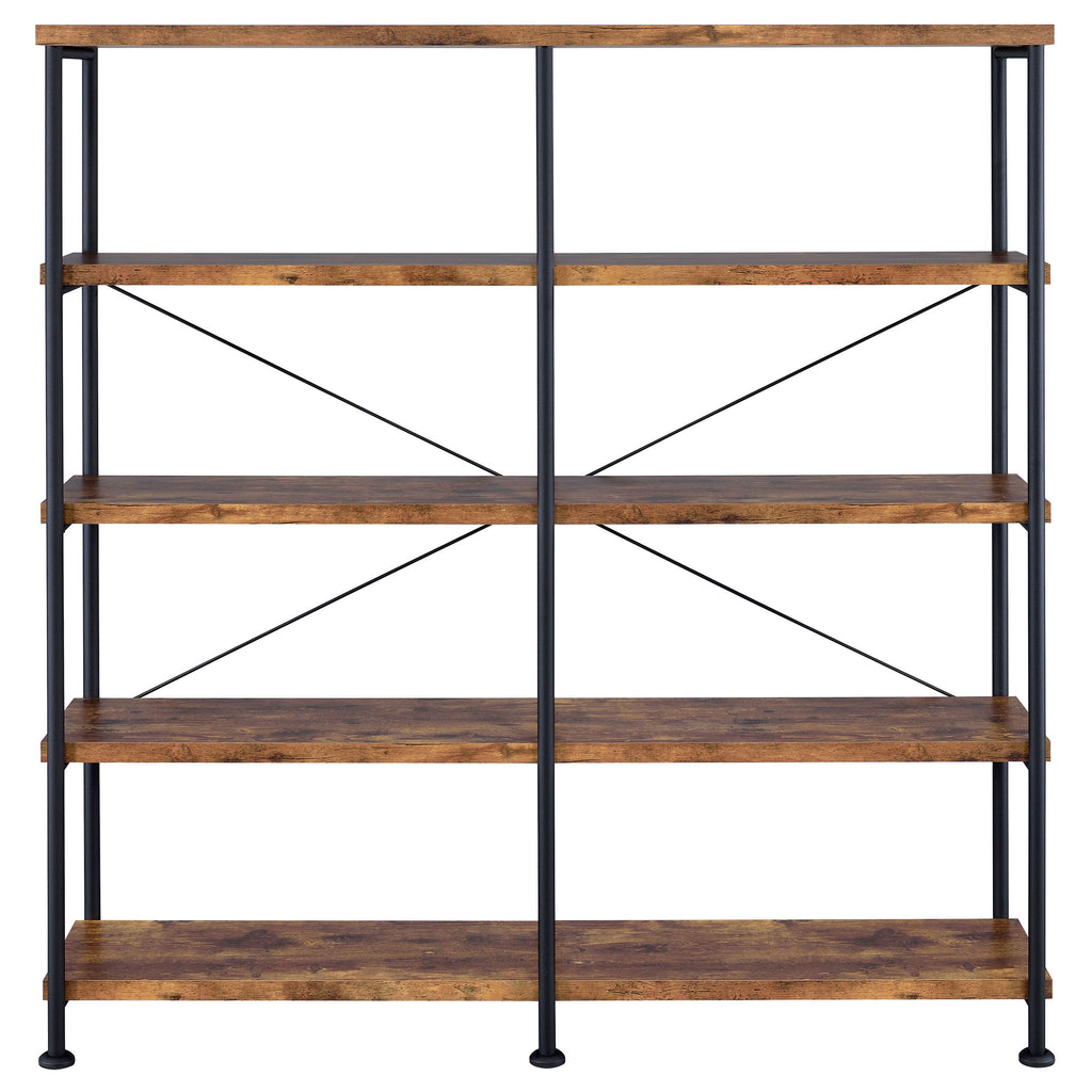 Embrace a traditional look with contemporary upgrades. Choose this bookcase to organize accents and books in a transitional space. Minimalist styling reflects a classic dynamic reflecting a hint of industrial aesthetics. Find plenty of room on four side shelves to display books and decor. Select from finishes that suit your space. Key Features: • Double bookcase with four extra-wide tiers for ample display and storage space • Rustic nutmeg finish offers a warm wood tone with industrial character • Black powder-coated steel frame enhances contrast and structural stability • Crossbar detailing on the back reinforces support without adding bulk • Open shelf design keeps contents visible and accessible from all sides • Made from engineered wood, melamine paper, and heavy gauge metal