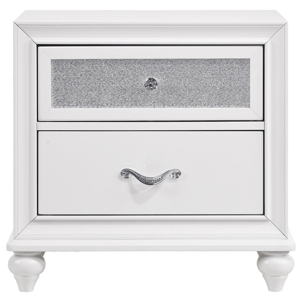 Transform your bedroom with the elegant design of this white set. The panel bed showcases metallic leatherette channel tufting framed by crisp molding and finished with turned feet for timeless charm. Coordinated storage brings added sparkle with glittery acrylic panels and faceted crystal hardware, blending modern radiance with classic details. Sculpted bun feet complete the look, while solid rubberwood, engineered wood, and okume veneer provide durability for lasting beauty and function._x005F_x000D_ Key Features: • Bedroom set in white finish combines timeless elegance with glamorous design • Panel bed features metallic leatherette channel tufting with molding details • Sparkling acrylic accents add radiance to the clean white storage surfaces • Crystal hardware enhances drawers with brilliant jewelry-like shine • Ample storage keeps clothing and essentials organized in style • Crafted with solid rubberwood, engineered wood, and okume veneer for quality