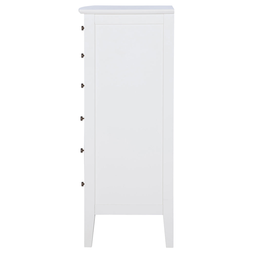Create ample storage in your stylish bedroom with a modern eight-drawer chest. Its coastal style is established with a cool white finish paired with natural rattan finish accents on its drawer fronts, offering compelling contrast and texture. Eight drawers include four small and four large, with black felt lining in the top drawers to add a touch of luxury and protection. The case features a gently bowed front that adds inviting energy to its silhouette. A roomy top is ideal for decor and personal effects, perfect for framed photos and a jewelry box. Key Features: • Coastal details highlight a modern eight-drawer chest to bring compelling, fresh style • Crisp white finishing complements poplar and engineered wood, with rattan accents to create texture • Four small and four large drawers create ample storage for accessories and clothing • A convex front and natural rattan drawer fronts create a charming, textured look and feel • Top drawers include black felt lining, adding protection for delicate items