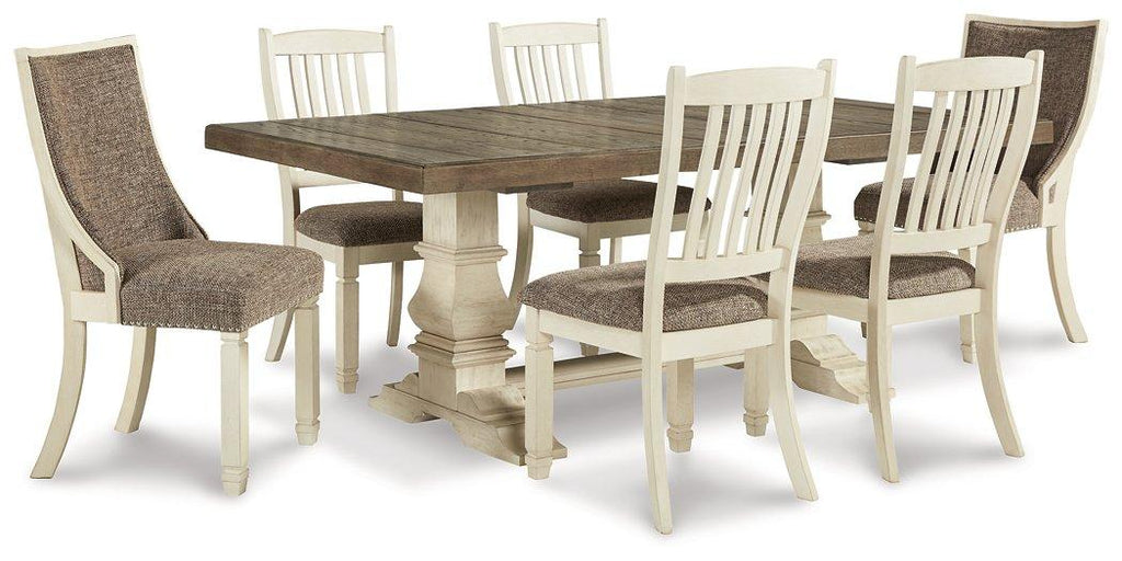 Enjoy beautiful cottage style with this classic dining table set. With a rustic planked top, this table serves up casual with a vintage twist. The gently distressed tabletop, paired with the rake-back design of the chairs in a textured antique white finish, is a perfect set for impromptu gatherings. With six built-in drawers, you can keep placemats, napkins and utensils on hand for maximum practicality in any living space. For a quaint ensemble you're bound to love, choose this set.