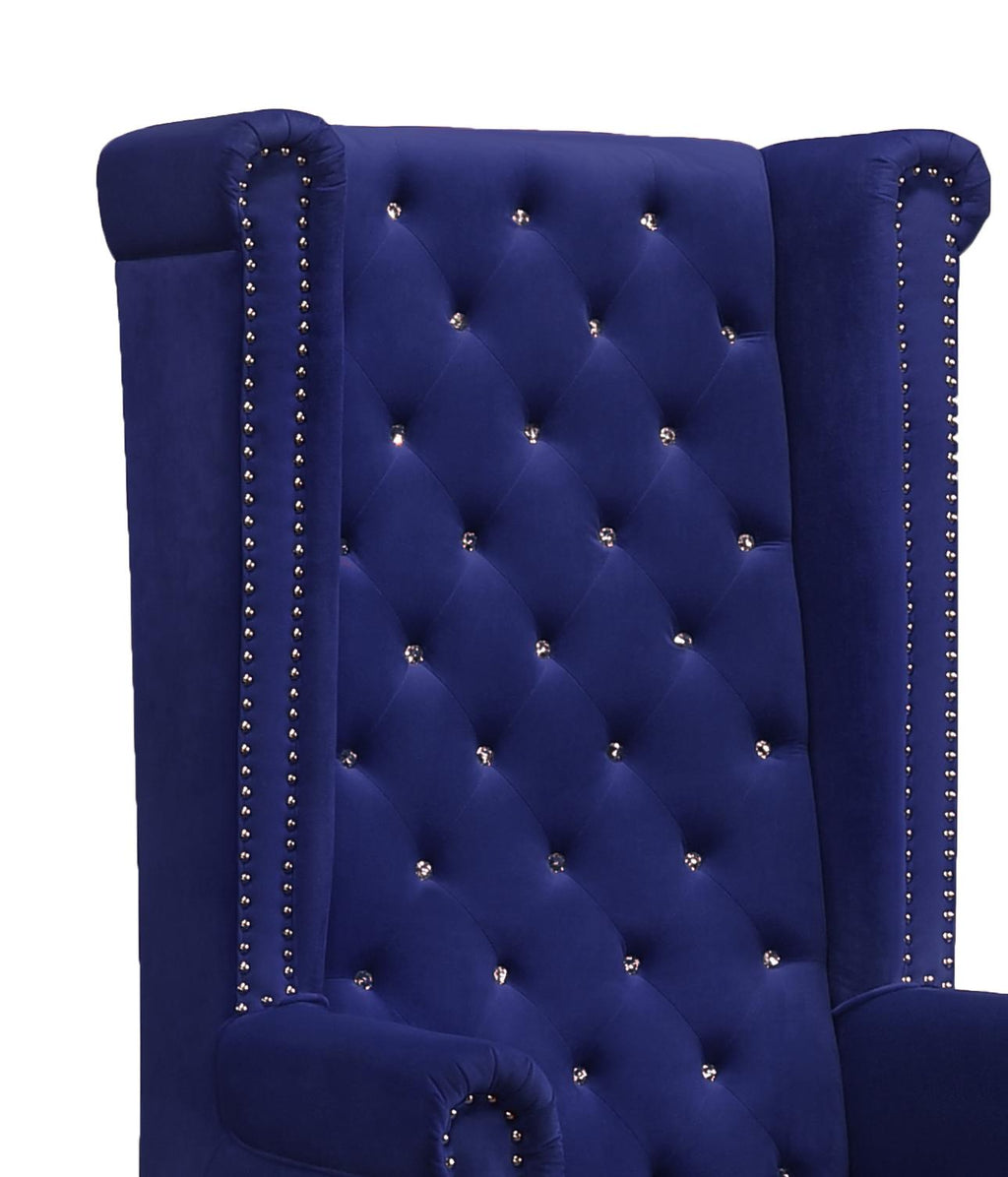 Cosmos Furniture's Bollywood transitional style velvet accent Blue Chair with nail heads and crystal button tufted back in black finish wood. The Bollywood high back chair is a great addition to your any room. This modern design is perfect for the head and/or foot of your dining table, living room, Bedroom and/or foyer providing dramatic layout. Built from a strong hardwood frame, covered with soft fabric, while complimented with a well-padded seat and tufted wing back chair is outfitted with nail head trim for extreme comfort. Make the Bollywood Chair a signature piece in your home. More colors available.