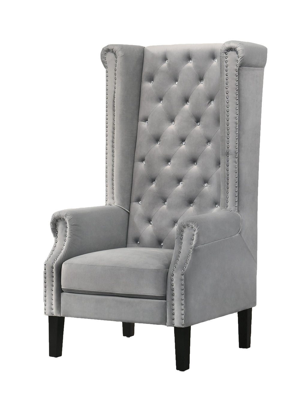 Cosmos Furniture's Bollywood transitional style velvet accent Silver Chair with nail heads and crystal button tufted back in black finish wood. The Bollywood high back chair is a great addition to your any room. This modern design is perfect for the head and/or foot of your dining table, living room, Bedroom and/or foyer providing dramatic layout. Built from a strong hardwood frame, covered with soft fabric, while complimented with a well-padded seat and tufted wing back chair is outfitted with nail head trim for extreme comfort. Make the Bollywood Chair a signature piece in your home. More colors available.