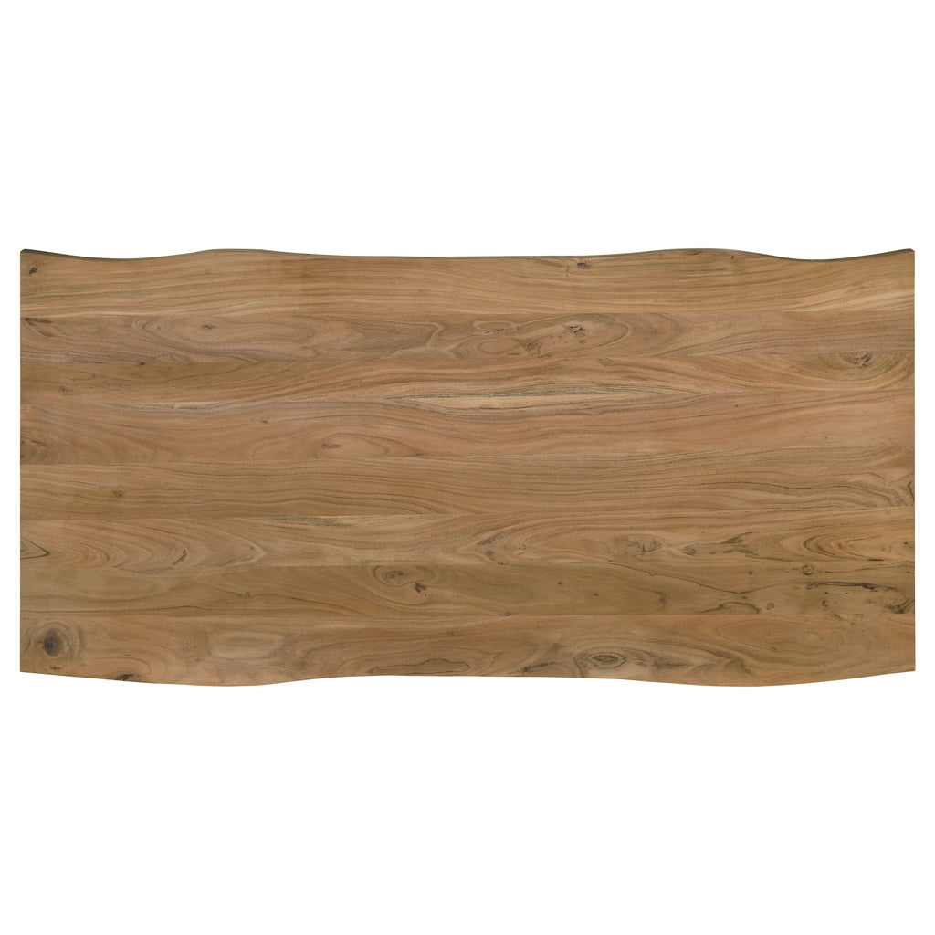 Revitalize your dining room with the exquisite beauty of this contemporary dining table. The solid acacia live edge table top boasts unique markings and stunning wood grain, adding a touch of natural charm. Contrasting with the sleek double pedestal black iron legs, this table is a captivating blend of rustic and modern styles. Make a statement with this striking centerpiece for unforgettable dining experiences. Key Features: • Create a stunning centerpiece for your dining room with this contemporary dining table • The solid acacia live edge table top features unique markings and stunning wood grain, adding a touch of natural charm • Contrasting with the sleek double pedestal black iron legs, this table is a captivating blend of rustic and modern styles • Enjoy unforgettable dining experiences with this eye-catching table • Revitalize your dining room with the exquisite beauty of this contemporary dining table