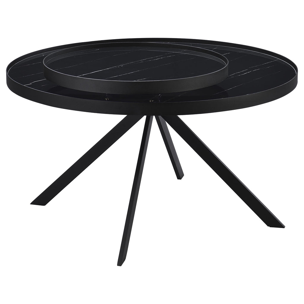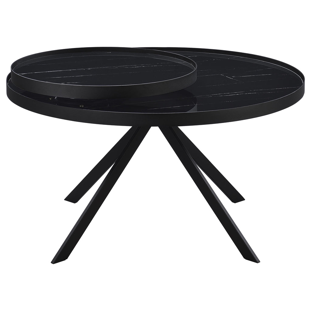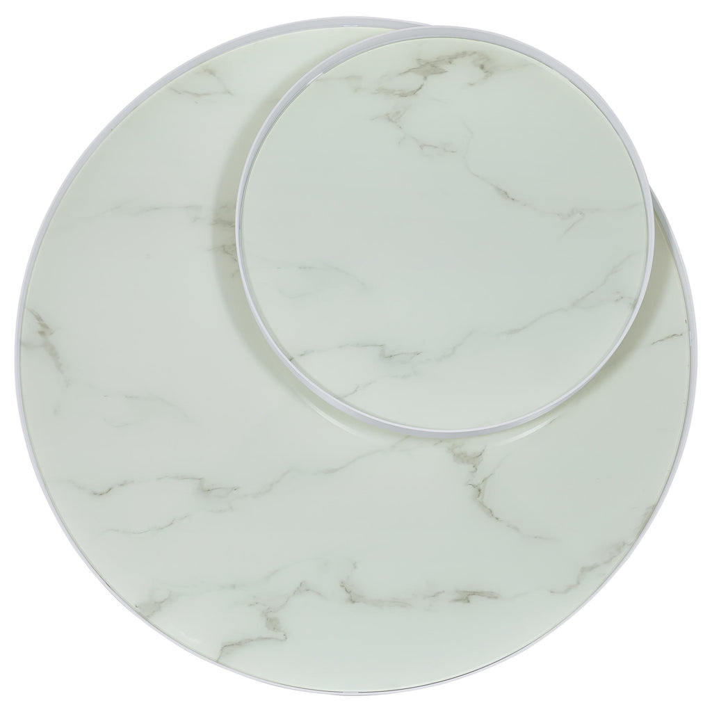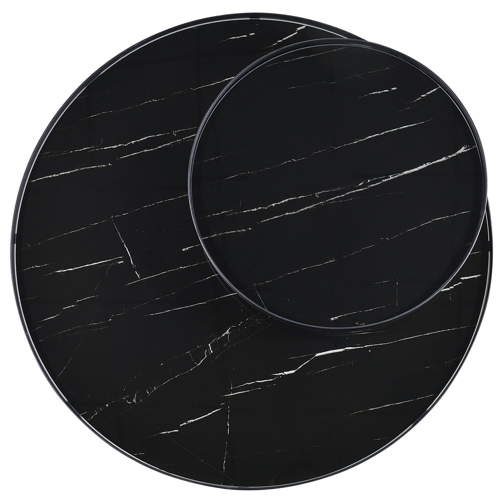 This modern two-tier coffee table features a sleek metal frame and tempered glass tops with marble-pattern printing for a refined aesthetic. Its multi-level design offers added functionality, perfect for displaying decor or organizing essentials. The sturdy metal construction ensures durability, while the smooth surfaces create a clean, contemporary look that enhances any living space with style and practicality. Key Features: • Two-tier coffee table with tempered glass tops • Stylish marble-pattern print enhances visual appeal • Sturdy white metal frame ensures lasting stability • Multi-level surface with smaller swivel table ideal for storage or display needs • Tempered glass surface is durable and easy to clean • Ideal centerpiece for modern living rooms