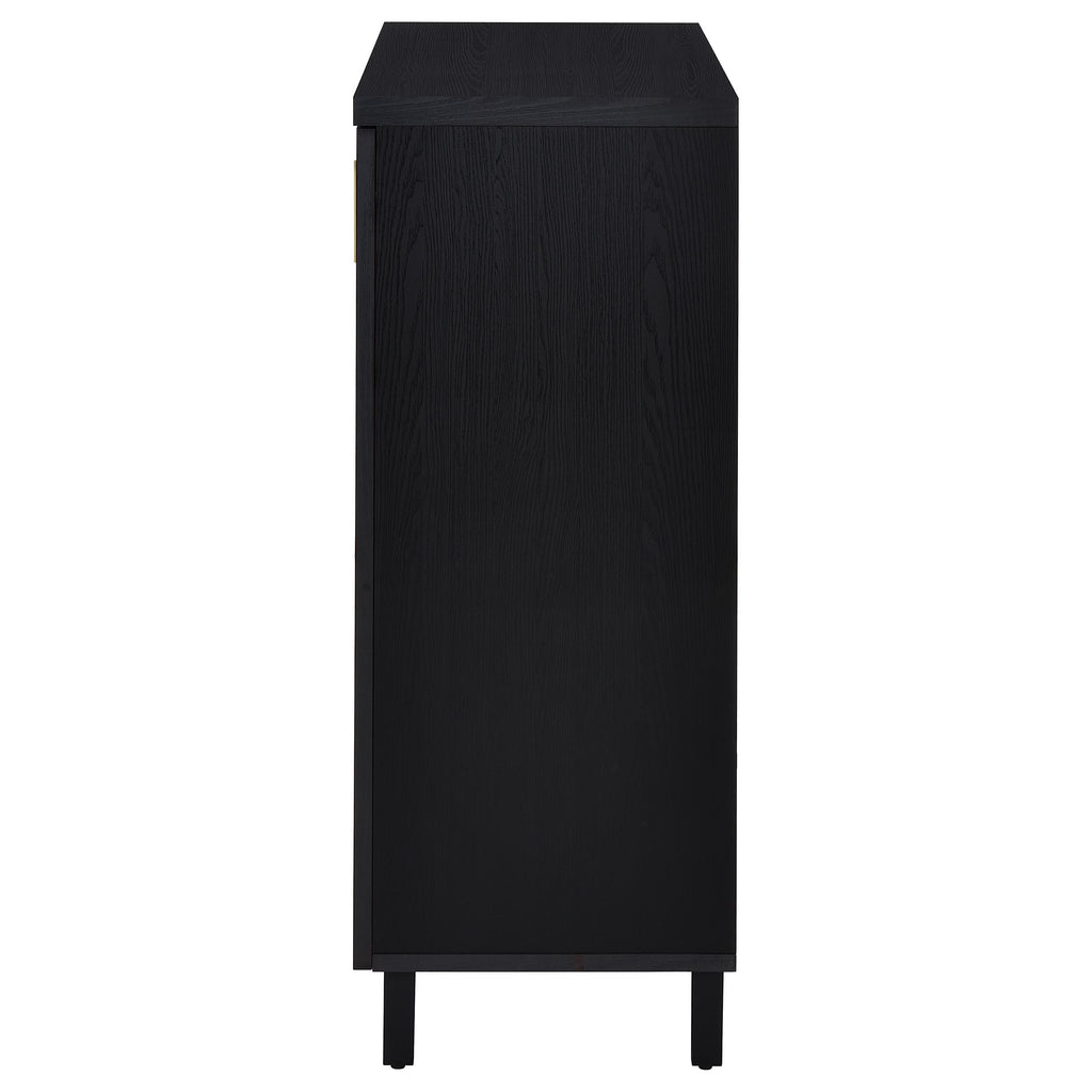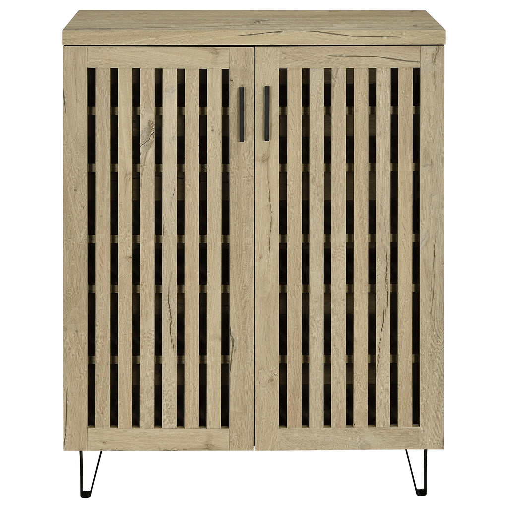 Transform your foyer or hallway with this versatile shoe cabinet, designed to keep your footwear organized and out of sight while complementing a variety of interior styles. Behind its distinctive vertical-slatted doors, multiple adjustable shelves provide ample room for everything from everyday sneakers to formal footwear. Crafted from engineered wood with a durable laminate veneer, it rests on slender metal legs, creating a balanced silhouette that enhances both form and function.