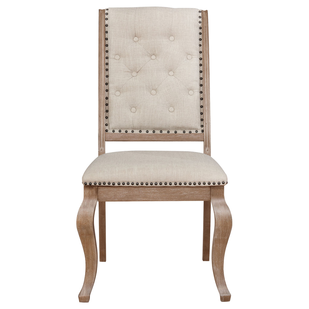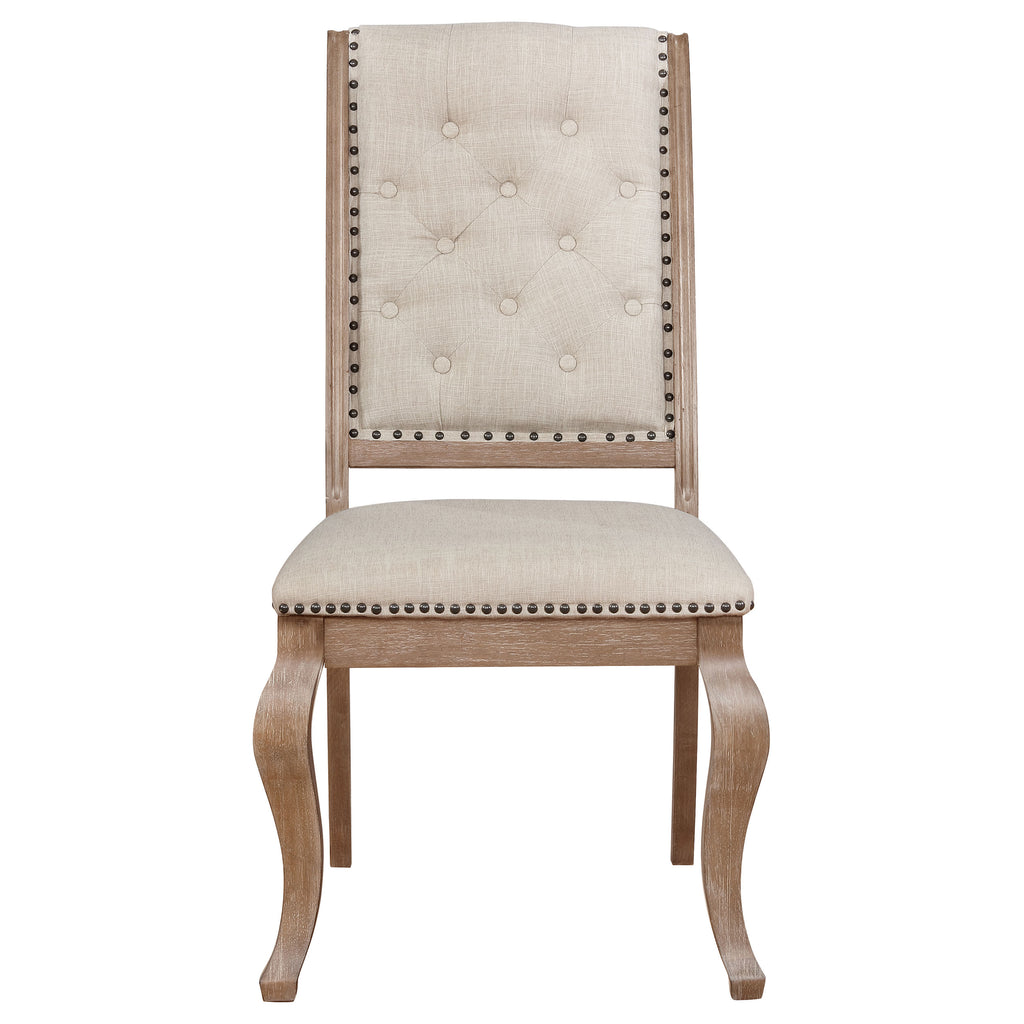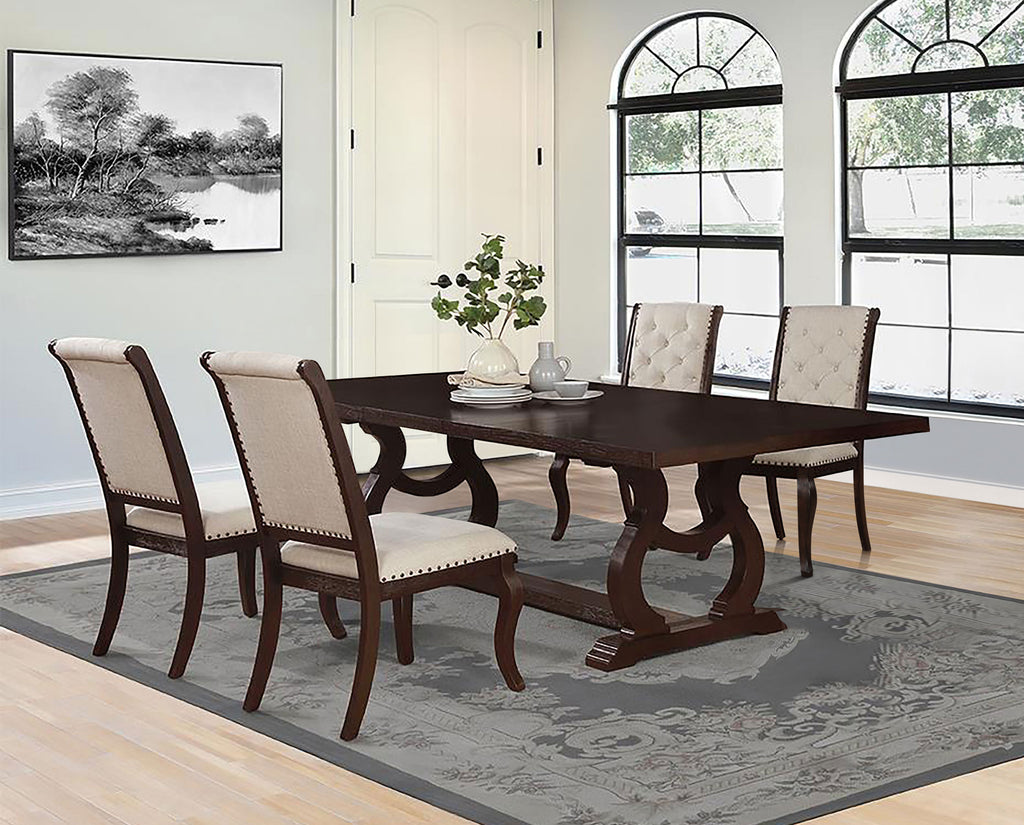 Terrifically transitional with subtle glam details comes this wood and upholstered dining set. Including a 20†removable extension leaf, this beautiful wood dining table is finished in a natural wood color with distressed wood grain accents. The dual pedestal base offers a final touch of traditional appeal. Find gorgeous coordinating dining chairs, upholstered in cream fabric. The dining chairs are adorned with individually applied nailhead trim with cabriole style legs for a finishing touch.