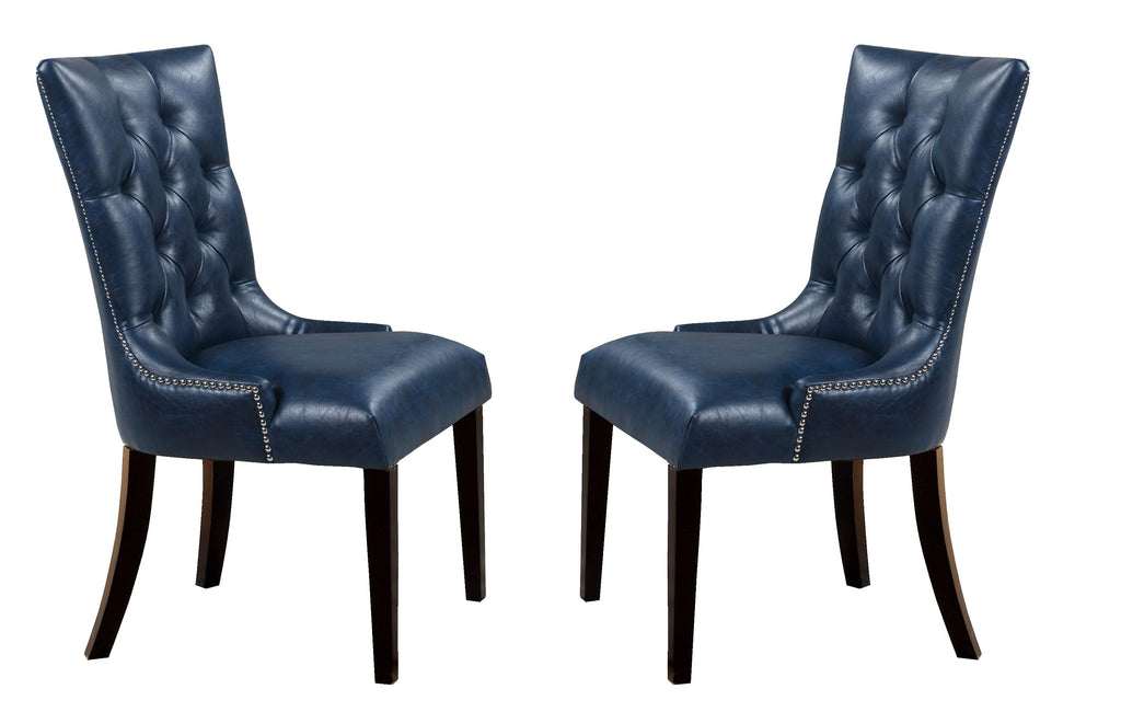 Cosmos Furniture's Brooklyn contemporary style Navy Dining Chair with Espresso legs come as a Set of Two (2) Chairs. Brooklyn Navy Dining Chair has a commanding presence in any dining room. These strikingly beautiful chairs with button tufted parson chairs, high backrest is in contrasting color. Highly fashionable set will fuse with the surrounding decor, transforming a dining room from ordinary into something interesting and sophisticated. Sold as a set of 2. Matching Brooklyn Dining Table, more Brooklyn Chairs and Brooklyn Server are sold separately.