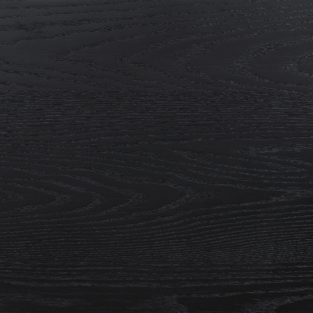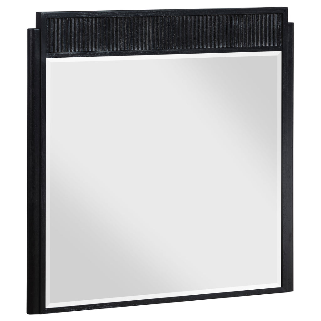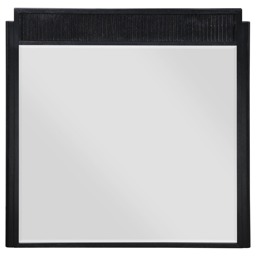 A rich black finish create a sophisticated palette for a four-piece modern bedroom set. Complete with wire brushing that creates texture, the set features fluted details that add elegance and character. The bed features an open silhouette with a low footboard, while a tall headboard centers your space. A two-drawer nightstand includes a felt lined top drawer to protect delicates like your watch or phone, leaving plenty of space in the bottom drawer for books and other essentials. The dresser and mirror set completes the look, offering plenty of storage in eight drawers, including felt lining in the top two, for clothing and accessories.