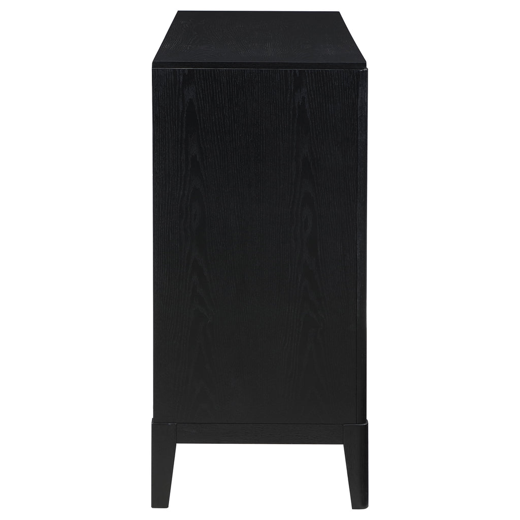 Create a single place to organize clothing and accessories with a stylish, modern eight-drawer dresser. Its timeless stance is augmented with a black finish complete with wire brushing that creates subtle texture and dimensionality. Drawer fronts offer fluted texturing, creating a sense of depth and movement. Half-moon drawer pulls complete the look with a soft golden metallic finish that gleams in the light and adds impeccable warmth. Top drawers include felt lining to protect your delicates, while lower drawers are larger, perfect for everything from sweaters to linens. Key Features: • Stylish and modern, a contemporary wood dresser features a wire brushed black finish • Fluted texturing highlights eight drawer fronts to provide sophisticated dimensionality • Drawers feature demi-lune metal handles in a warm golden tone for sophisticated contrast • Top drawers include felt lining in matching black, offering easy protection to delicate items • Tapering legs complete the look while offering stability and support • Drawers feature English dovetail joinery for excellent craftsmanship
