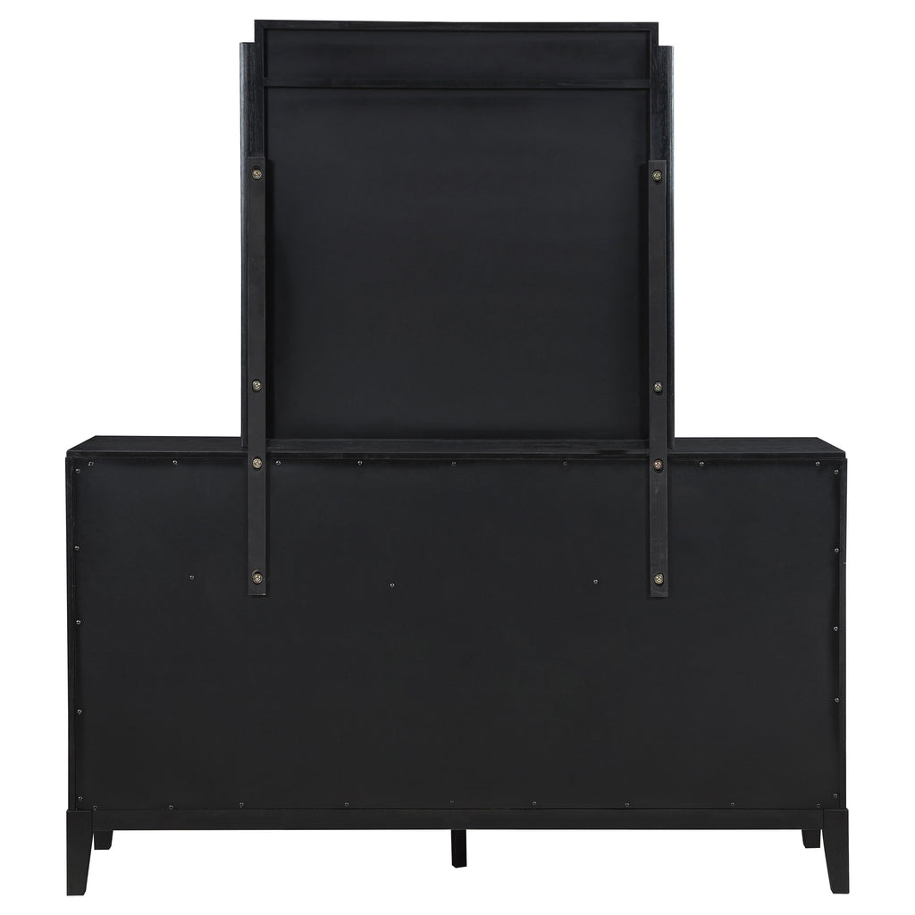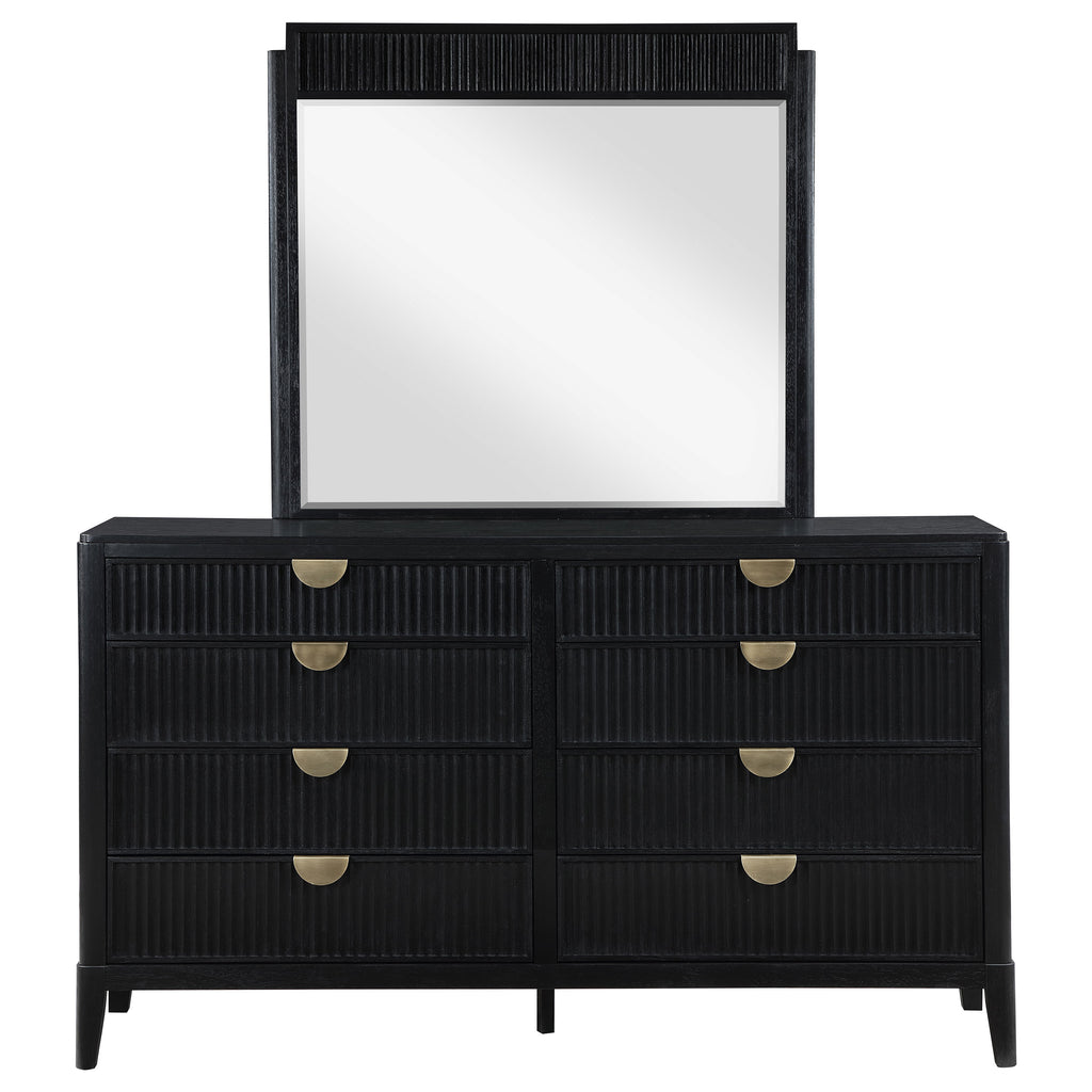 Dress up your bedroom with the impeccable texture and styling of a modern eight-drawer dresser and mirror. Vertical fluting decorates each drawer front and crowns the mirror, offering a refined, artistic touch that elevates without overwhelming. A black finish is rich and deep, perfect to blend with a variety of existing decor and furniture pieces. Its drawer fronts feature vertical fluting details and half-moon handles in a golden finish, delivering the perfect blend of contrast and texture. A framed mirror on top completes the look and offers reflectivity and depth in your bedroom. Key Features: • Chic fluting adds depth and dimension to a modern eight-drawer dresser and mirror • Includes eight drawers of various sizes to accommodate all your clothing and accessory storage needs • Black finish is rich and deep, complementing in many different bedrooms and dressing areas • Half-moon drawer handles are warm and inviting, with a gold finish that adds contrast and dimension • Top drawers include felt lining that offers protection to delicate items, jewelry and accessories • The beveled mirror creates an illusion of depth and dimensionality