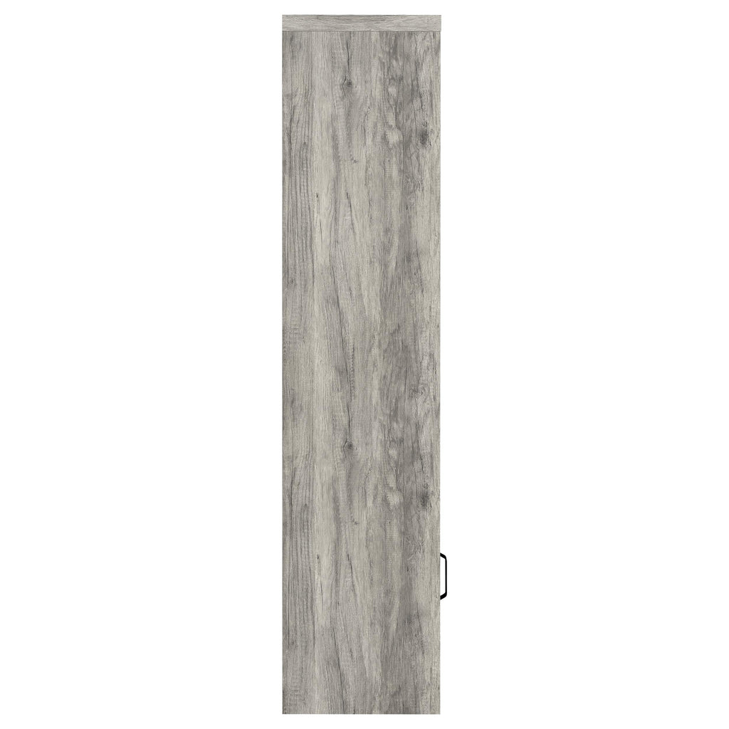 Tall and slender, this modern media tower is the perfect complement for your entertaining needs in both compact and larger spaces. Organize media, books, and implements on shelves and interior shelves, staying organized and uncluttered. Melamine construction features a distressed weathered gray finish with grain-like markings, offering rustic vibes. Find space on three fixed shelves and one adjustable shelf, all ready to separate and store gaming supplies, media, or books. A single black finished metal hardware pull offers an ideal match. Key Features: • Modern media tower suitable for various space sizes • Organize effortlessly with shelves and interior compartments • Distressed weathered gray finish for rustic charm • Three fixed and one adjustable shelf for versatile storage • Single black-finished metal hardware for a cohesive look