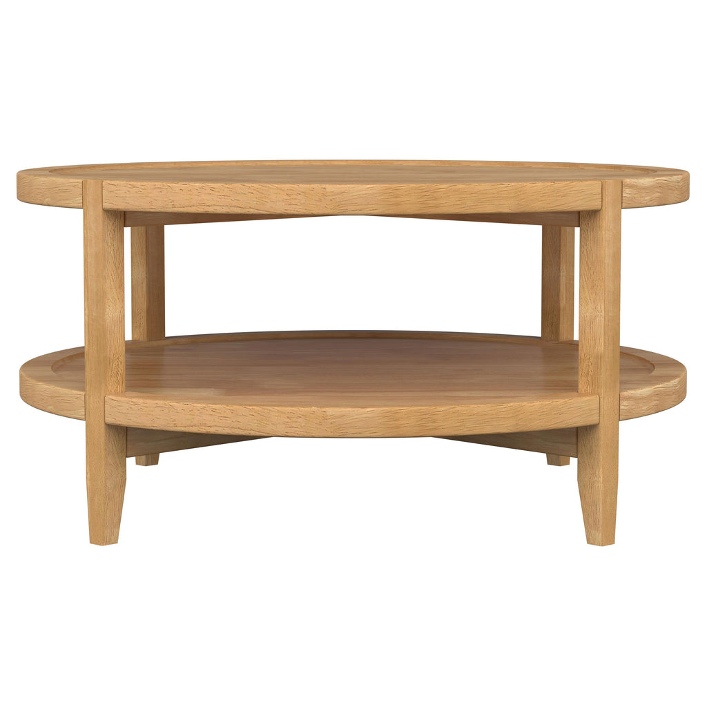 Start fresh with the warmth and inviting ambiance of a modern farmhouse coffee table. Made from rubberwood, it features a maple finish that's timeless and welcoming, perfect for a family room. The round table creates flow and offers a lovely focal point for a larger seating group. Its full lower shelf is a great place for decor that adds a personal touch. Both the table top and shelf have a slight dip, creating a tray-like effect that adds a great touch of dimensionality. Key Features: • Round coffee table designed as a stylish and practical living room centerpiece • Warm maple finish enhances the natural beauty of its sleek, timeless design • Recessed top and shelf edges create a tray-like effect for added dimensionality • Full lower shelf provides ample space for storage or decorative displays • Solid rubberwood construction ensures exceptional strength and durability • Perfect for modern farmhouse or transitional interiors with versatile appeal