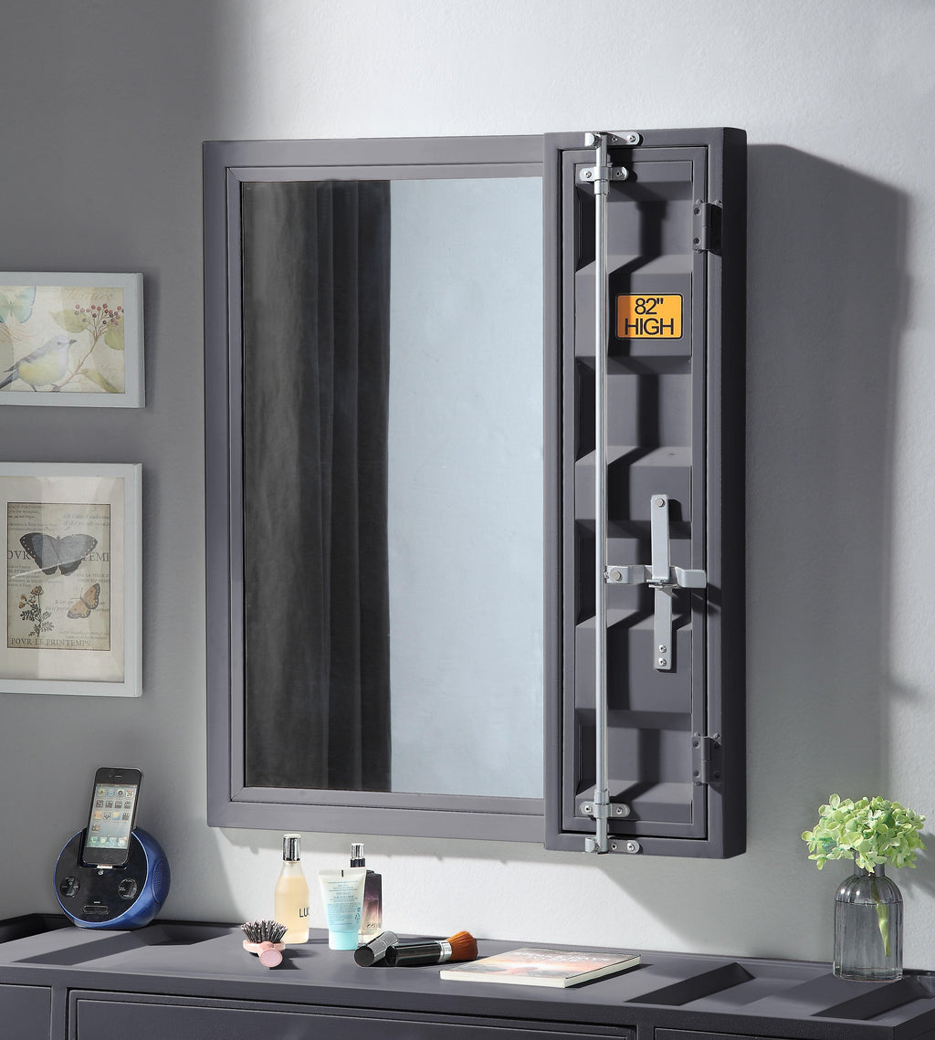 ACME Cargo Vanity Mirror, Gunmetal, 26" x 32"H, 29Lbs. Materials: Metal, Mirror, Composite Wood