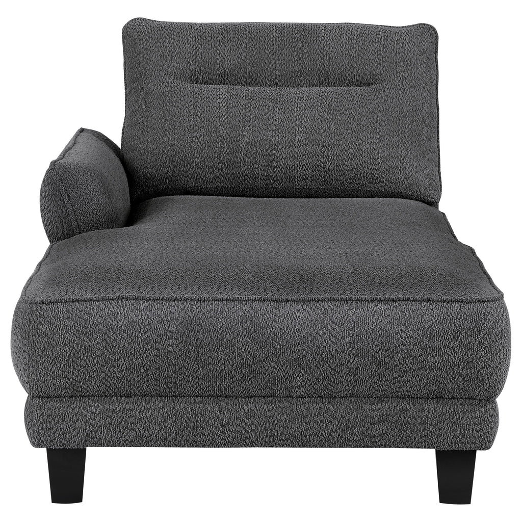 Experience ultimate comfort with this modern two-piece sofa chaise, available in grey or white. The fuzzy teddy bear-like textured fabric upholstery creates a cozy atmosphere. The softly rounded arms and welt framed reversible back cushions add a touch of sophistication. With attached welt-accented boxed seats and solid wood tapered legs, this sectional ensures a well-kept appearance and sturdy foundation.