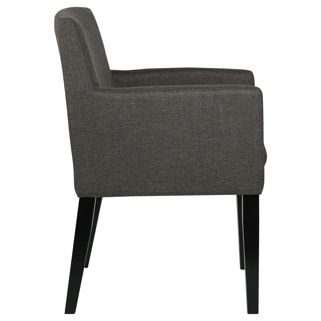 Introducing a beautiful dining room collection with clean, modern lines. The dining table boasts a oak veneer top with a black finish and a stunning tambour base design featuring fluted patterns on the double pedestal legs. The mid-century-inspired dining chairs have cushioned arms wrapped in durable charcoal grey fabric, offering comfort and style for any casual dining room. Key Features: • Introducing a modern dining room collection with a stunning tambour base design • Dining table features an oak veneer top with a black finish • Double pedestal legs feature fluted patterns for a mid-century inspired look • Dining chairs have cushioned arms wrapped in durable charcoal grey fabric • Comfort and style for any casual dining room