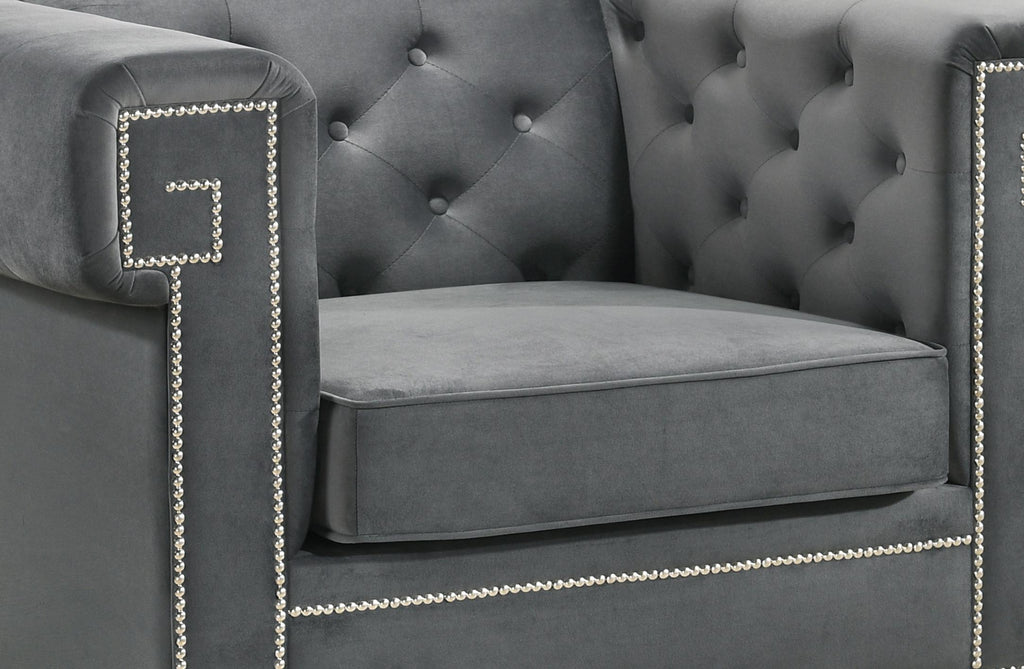 Cosmos Furniture's Clover Gray modern style Chair in lush blue velvet has steel legs with chrome nail head trim finish. The Clover Gray Chair is elegant and eye catching and is the perfect addition to any space. Modern tufted design shown by the velvet blue color cover, tufted buttons and chrome nail heads. The strength and beauty are guaranteed with sturdy wood frame and chrome legs. This chair is bound to be the conversation piece. Two (2) throw pillows are included. Matching more Clover Gray pieces are sold separately to complete the set.