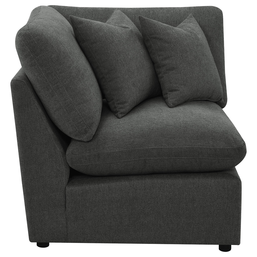 Convert your modular sofa into a sectional with the corner chair, designed to fit perfectly in any corner. This chair includes two plush pillows and features premium down-like filled cushions for a luxurious seating experience. The sleek, modern design enhances any decor, making it a perfect addition to your living space.