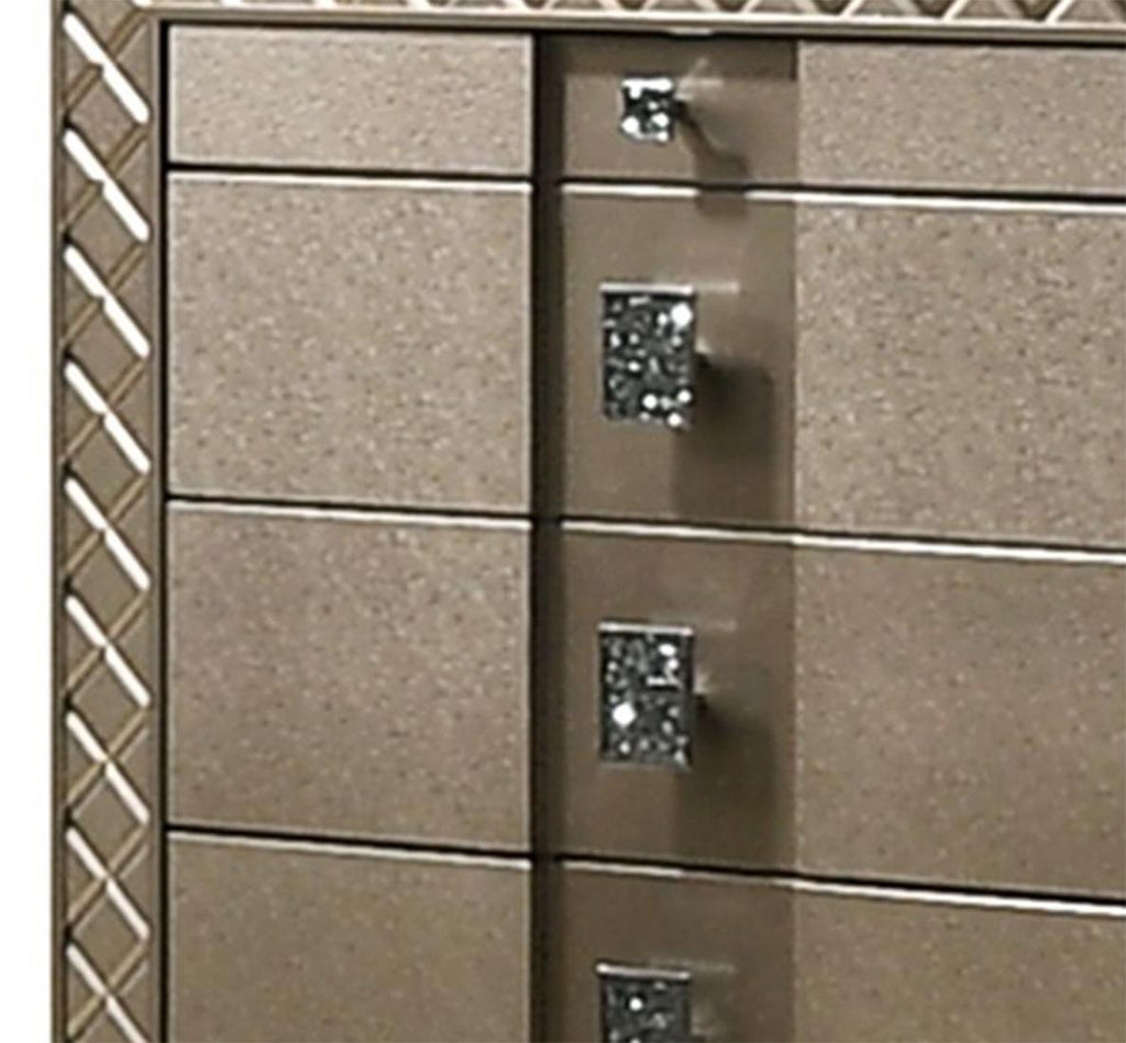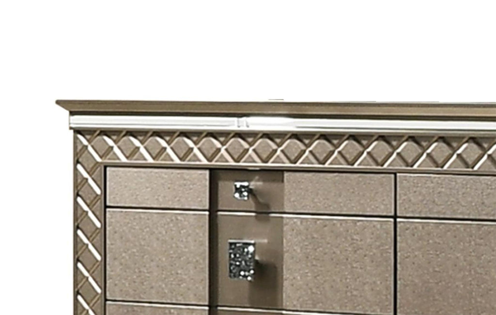 Cosmos Furniture's Coral contemporary style Dresser in bronze finish wood glamour reigns in the design of this collection. Alligator embossing and high polished crystal-enhanced hardware boldly accent the silver finish of the collection. The Coral Eight (8) drawers Dresser provides a dedicated space, 2-drawers that cater to your jewelry and accessories. The remaining 6 drawers are deep and equip with metal drawer glides, mixing quality and function. Matching bedroom pieces sold separately.