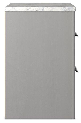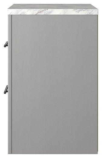 Cool, clean and casually modern. This nightstand’s wispy dove gray finish and faux Calcutta marble top set the tone for your calming sanctuary. Large linear pulls add dimension and authenticity. Two smooth-gliding drawers neatly accommodate your bedside needs.