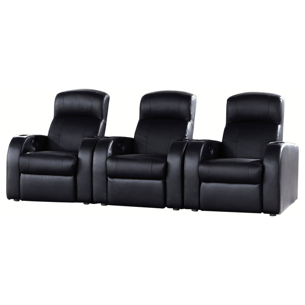 Get the movie theater experience at home with this set of recliners. Customize your home theater with your choice of seating configuration, available in numerous options. Optional center consoles offer unique storage for remotes and small items. Each top grain leather recliner is designed with its own cup holder for your favorite beverage. These black recliners are bound to improve your home theater experience and comfort levels.