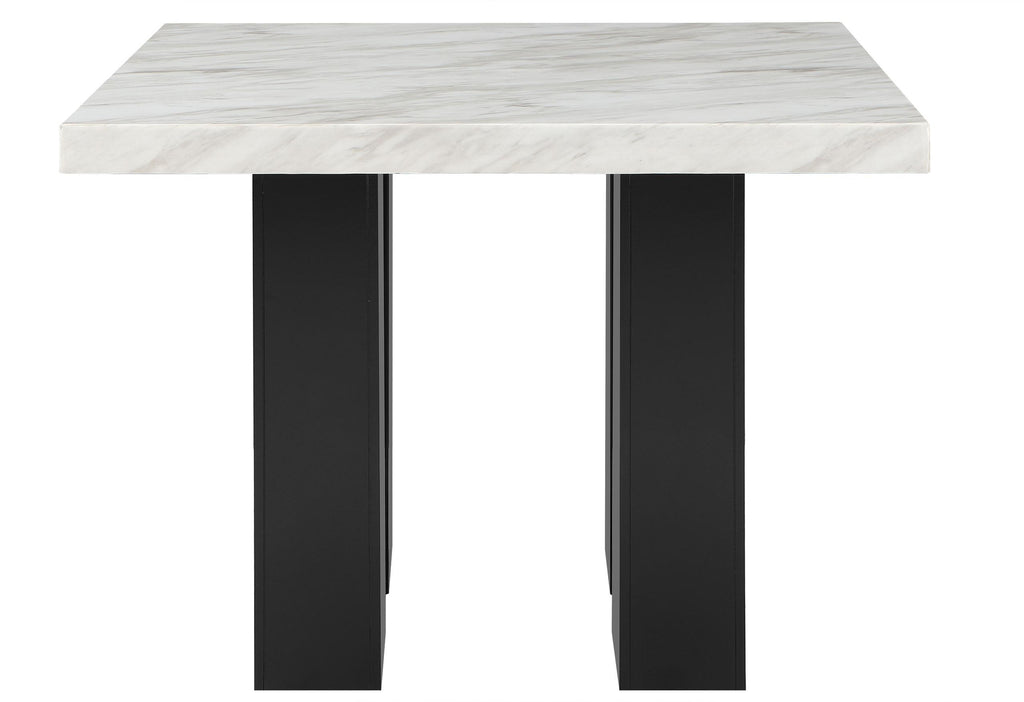 White Faux marble counter table design with an extra thick top and a double pedestal base with silver connectors.
