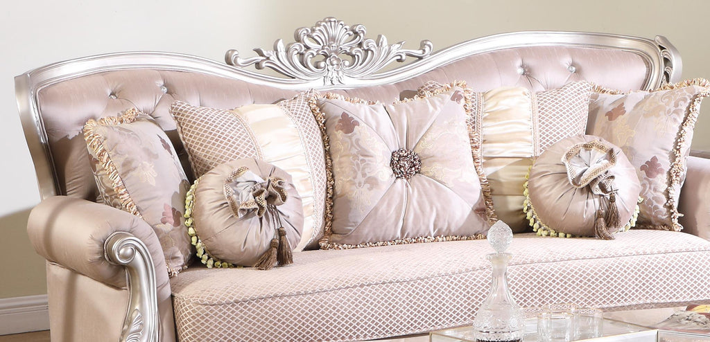 Cosmos Furniture's Daisy traditional style Sofa in pearl finish wood. The set is a sophisticated traditional design, with its soft curve upholstered tight back wrapping around with a half ellipse cut out at the center top. This inviting surround appeal is accented by loose pillows upon coil seat cushions to allow for any configuration for a comfort level desired. The sofa is accented with a solid wood rail that flows into concave arced front arm which create a great visual silhouette. The detail of the wood trim is emphasized by having a skirted base and allowing the contrasting wood trim to be more prominent. The elegant simplicity of this sofa allows it to fit into any room de_cor. Throw pillows are included. Matching pieces are sold separately.