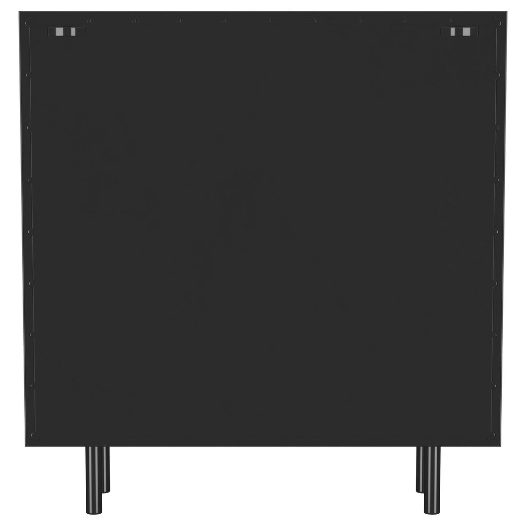 Create a stylish, engaging spot for easy storage with a modern industrial accent cabinet. Blending beautifully in casual, urban, and farmhouse settings, it features metal construction with a rich black finish that offers a neutral complement to your space. The cabinet features two clear glass doors with vertical ribbing that creates a wavy, watery effect and provides a touch of camouflage for items placed within. Metal overlays decorate the doors further, adding a geometric element sure to catch your eye. The cabinet opens to reveal two fixed shelves, great for everything from boardgames in the living room to serve ware in your dining room.