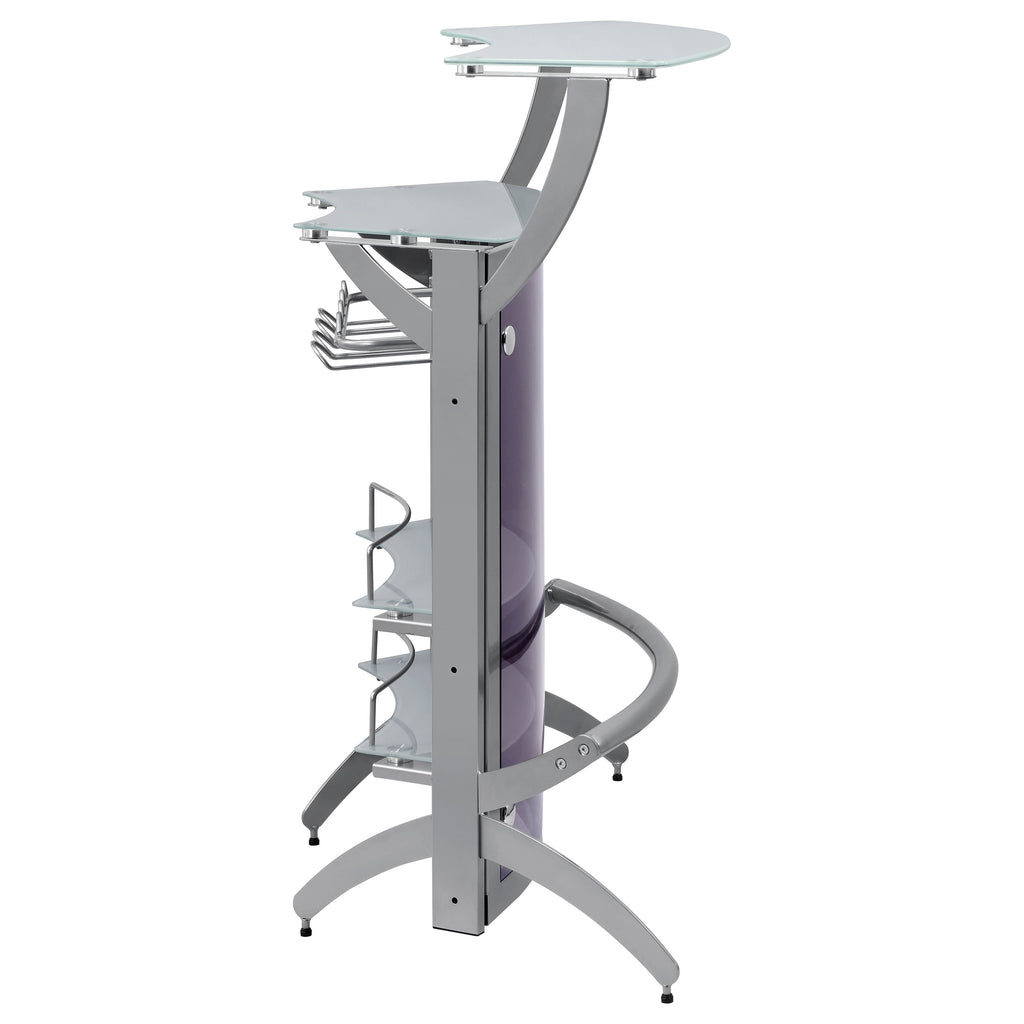 Presenting plenty of contemporary vibes, this home bar is sleek in every aspect. The black finish and acrylic construction give this piece an upscale look and feel. A rounded design offers storage space on multiple shelving units. Also included on this contemporary bar table are stemware racks to hold plenty of wine glasses. Whether you are entertaining a party of two or many, this contemporary bar table is the right choice for a stylish home. Key Features: • Contemporary bar unit showcases a curved chic design with metal frame in a silver finish • Smoked acrylic panels provide a high-end feel • Two-tier frosted tempered glass tops with two (2) frosted tempered glass shelves • Features stemware rack and three (3) bottle wine rack • Features 3 units, creating the ultimate bar setup