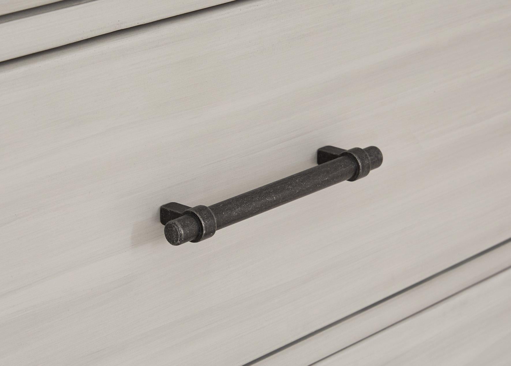 - Metal bar pulls with aged iron-tone finish
