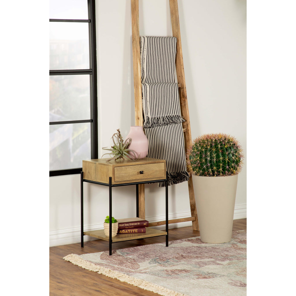 Blending modern industrial aesthetics with natural warmth, this accent table is both functional and stylish. Crafted from solid mango wood, the natural-finish tabletop and open bottom shelf showcase rich wood grain variations, while the sleek black iron frame adds a contemporary edge. A spacious single drawer, complete with matching black iron hardware, provides convenient storage for essentials, keeping surfaces clutter-free. Supported by slim yet sturdy rod legs, this table offers an open, airy design, making it perfect as a side table, nightstand, or accent piece in modern, industrial, or rustic interiors.