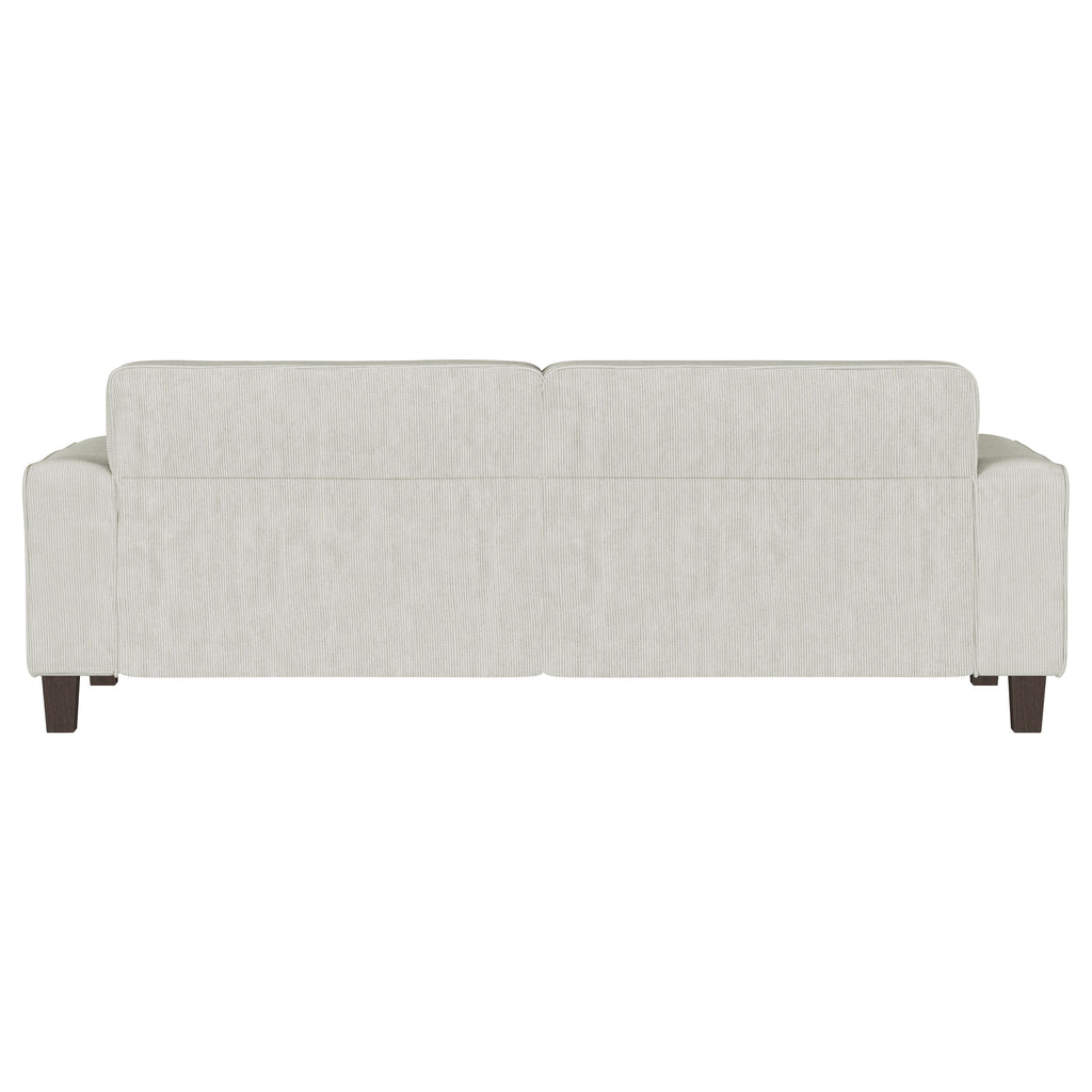 Create a stylish and infinitely comfortable and inviting living space with a modern sofa. Its timeless stance features wide track arms that pair perfectly with plush cushions for an indulgent seating experience. Great for game days, entertaining, or evenings at home, the sofa features plush upholstery with corduroy inspired texture that adds depth and dimension. Back cushions are plush and tufted, offering a grid pattern that's clean and refined. Tapering feet complete the look, offering height that creates an airy finishing touch perfect for modern living.