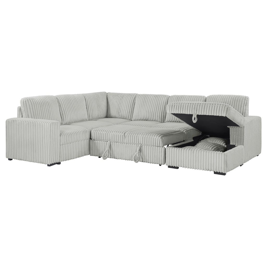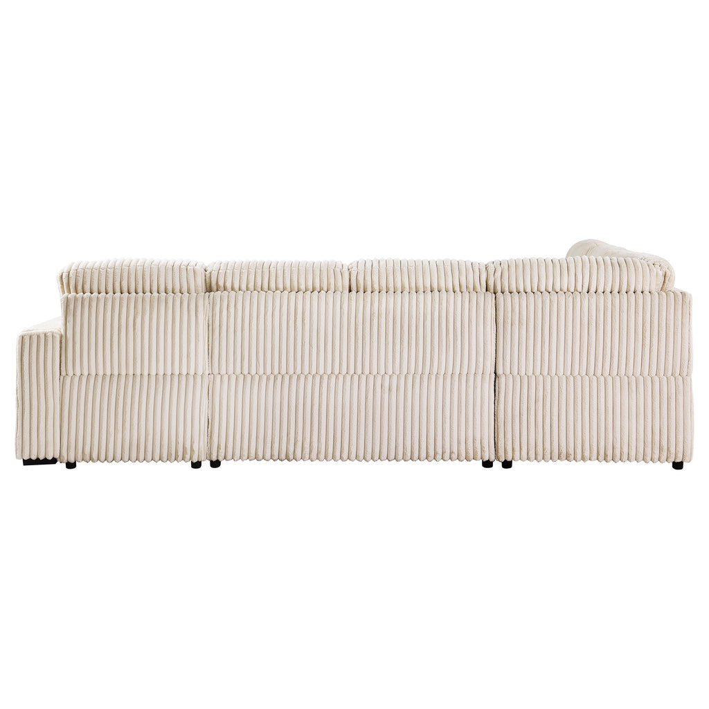 This versatile corduroy sleeper sectional effortlessly converts from cozy seating to a comfortable guest bed with its pop-up sleep surface. A spacious storage chaise keeps essentials at hand, while plush upholstery and three matching pillows provide lasting comfort and style. Its neutral tone complements any décor, making this piece an ideal centerpiece for relaxation, entertainment, and accommodating overnight guests. Built for durability, it seamlessly blends form, function, and modern appeal.