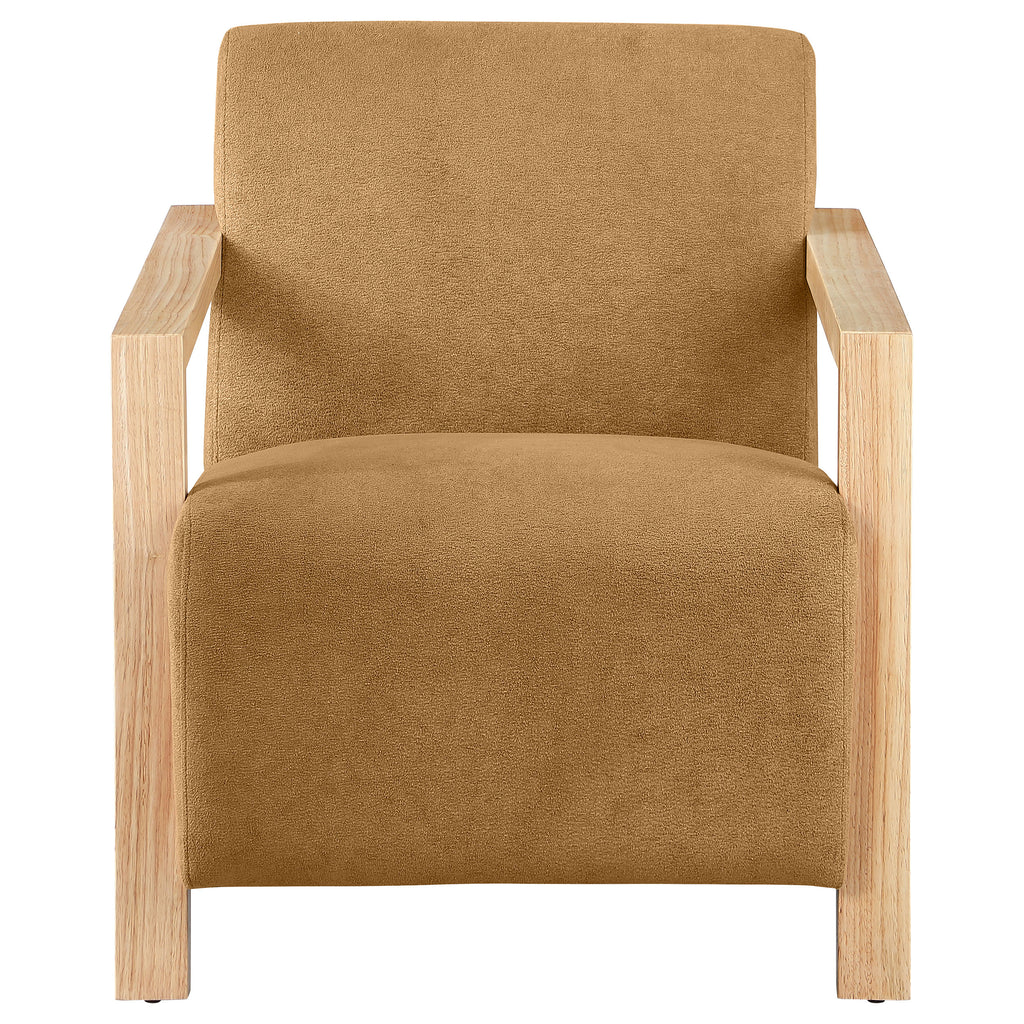 Put an inviting spin on a contemporary seating group with this modern accent armchair. Designed to stand out, it features soft, dimensional upholstery over plush foam cushions to create a smooth, sophisticated presentation. The chair boasts a smooth back and a wide seat with a waterfall edge, creating inviting presence and impressive comfort. It includes a pair of wooden armrests, each with an angular profile and straight, strong lines. Add this charming chair to an existing seating group or choose a pair to create a cozy complement.