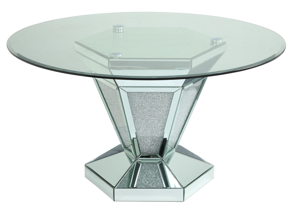 Cosmos Furniture's Diva modern style Dining Table in silver and glass is aesthetically in an entertainment ensemble. This is distinctive standish dining table with offering a modern twist on a classic pedestal-style silhouette. This design showcases an angular base with mirror and faux diamond inlay and a unique X shape pedestal base. Sleek and stunning, this modern table is complemented by tempered clear glass top. Both elements have come together to produce a truly visionary table that will make dinner parties all the more stylish. Enhance your room decor with this stunning dining room table. Matching Coffee Table and End Table also available and are sold separately.