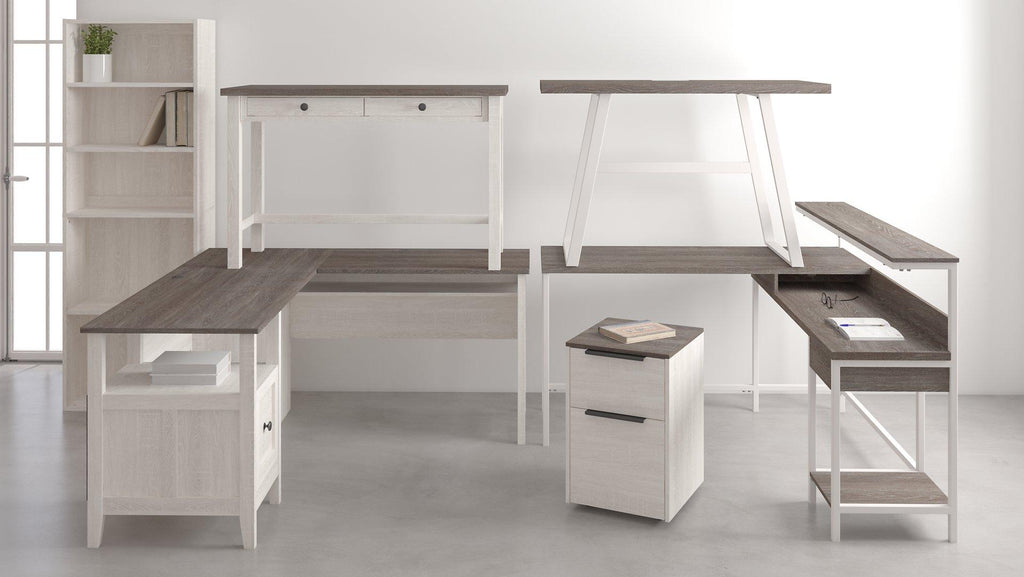More than just a beauty to behold, this home office L-desk is designed to raise your productivity by packing more work area into less space. Sporting a two-tone finish, it’s ready to take a cool stance for modern farmhouse style. Pair with the bookcase (sold separately) for a well-organized home office.