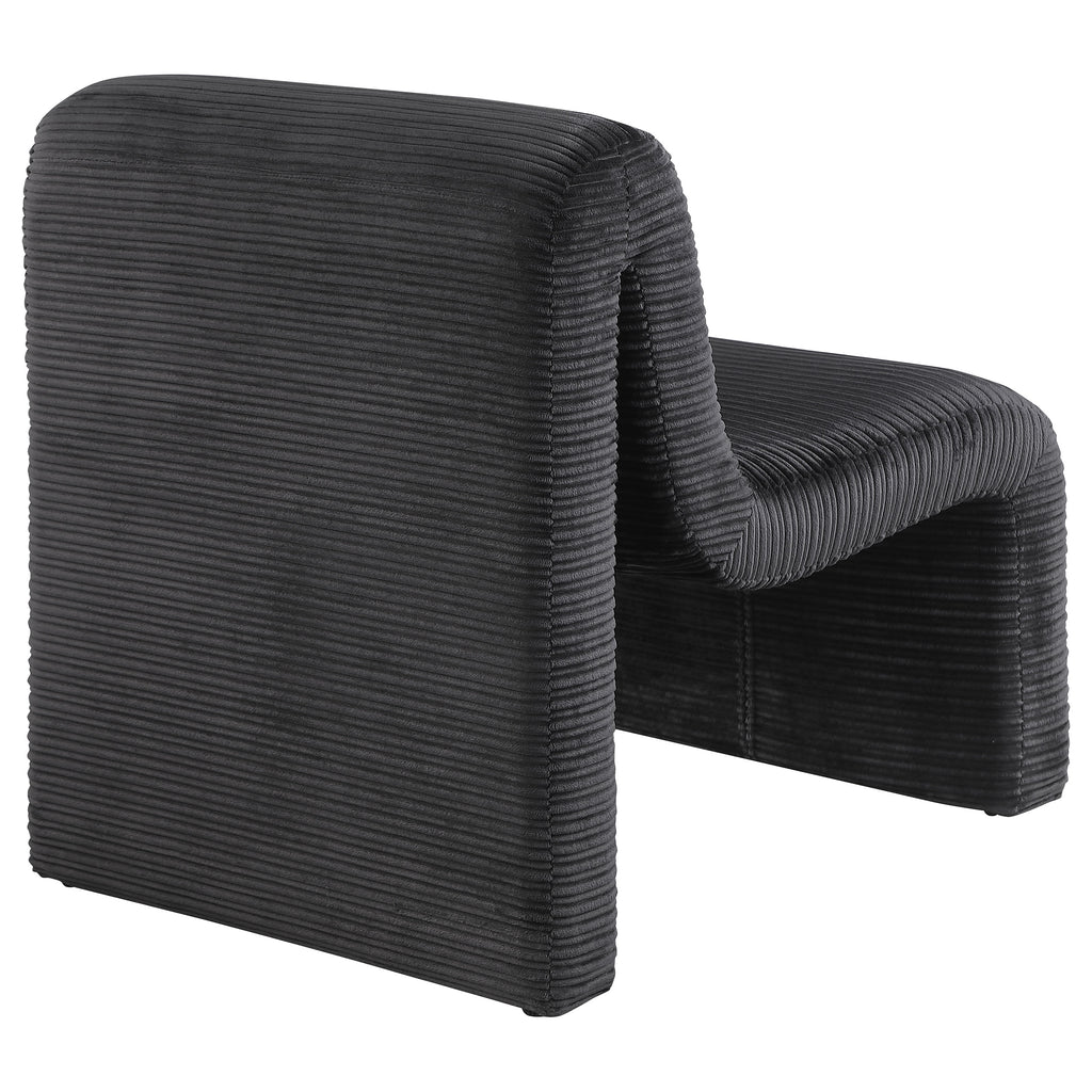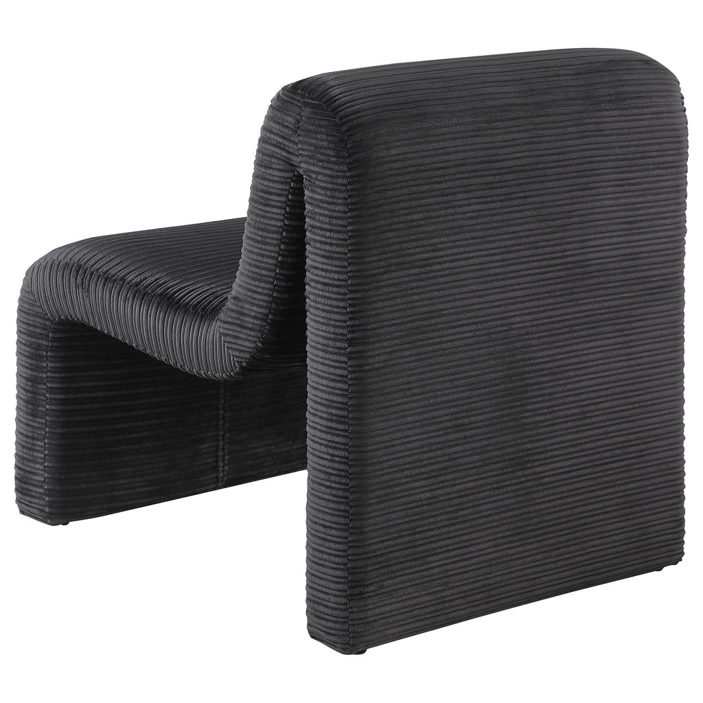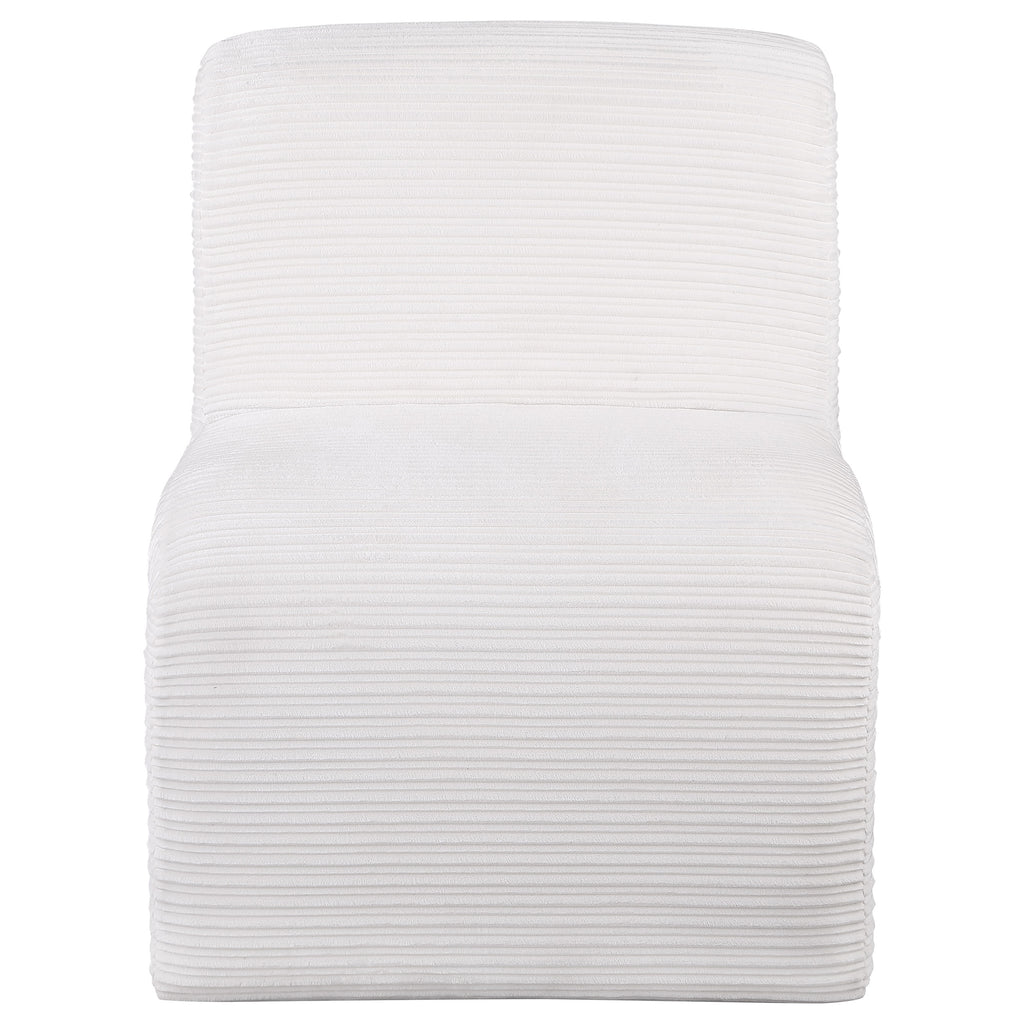 Introduce a sculptural component to your compelling seating group with this modern accent chair. It's an armless profile with a sinuous curvature that brings alluring elegance in any setting. Neutral upholstery has a ribbed look, creating impeccable texture and depth. The chair is structured with metal and plywood for durability, covered in foam for excellent cushioning that promotes comfort. Choose a pair for a refined living room or den setting. Key Features: • Upgrade a seating group with the curvy appeal of a modern upholstered accent chair • A sinuous silhouette brings modern artistry and elegance with sculpted presence • Ribbed texture highlights neutral upholstery, creating depth for robust curvature • Armless silhouette and curvy form create a compelling combination for your sophisticated living room • Legs include levelers that ensure a smooth placement on any flooring surface