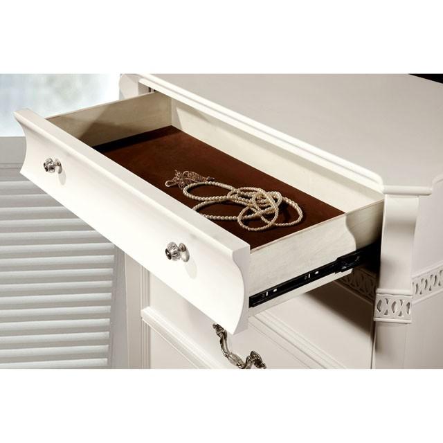 This gorgeous bedroom set features a lovely platform bed with storage drawers. Beautiful white loops adorn the headboard, while the clean white finish adds a charming touch.