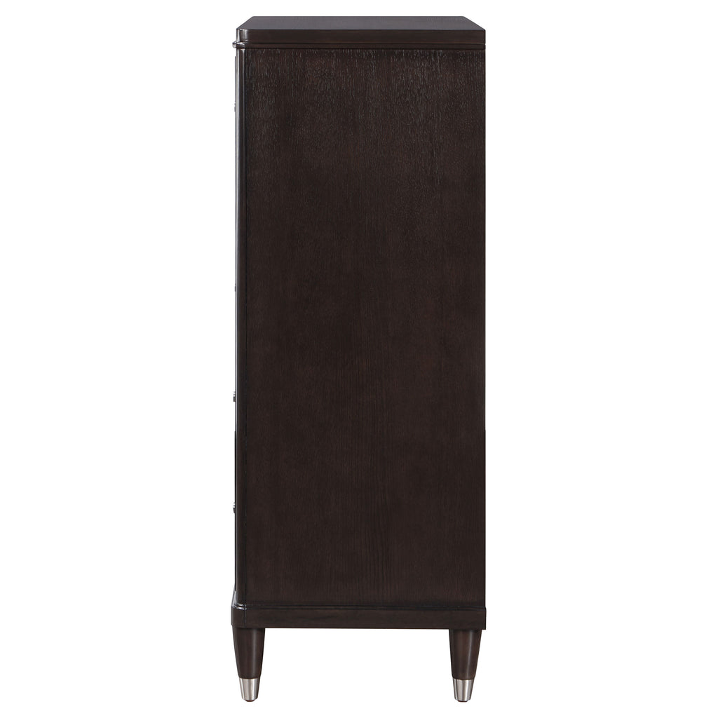 Gleaming knobs and foot caps add contrast and character to a modern five-drawer chest. Its deep brown finish is sleek and refined, perfect for a stylish bedroom with sophisticated presence. Its five drawers offer abundant storage. The top drawer includes felt lining and the bottom drawer is lined in cedar for additional protection for delicate items like jewelry and seasonal sweaters. The top of the chest is perfect for decor, offering a spot for a personal touch in your bedroom. Key Features: • A contemporary five-drawer chest offers stylish clothing and accessory storage and a refined look • Rich brown wood finish creates a neutral, sophisticated for a stylish bedroom ambiance • Tapering feet feature metallic finish caps that match round knobs on the drawers • Top drawer includes felt lining in a red-brown color for added protection for delicate items • Bottom drawer includes cedar lining to protect against pests