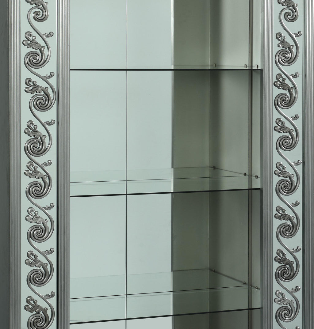 Cosmos Furniture's Eros modern style Cabinet with metal finish is a unique geometric base. Eros glass mirror cabinet crafts a sleek, fashionable look while providing functional storage. Place this mixed-material cabinet mirror at the enterance or in any room to mirror family get-togethers, or use in an open concept living space for a reflective display that dazzles. It has four (4) mirror shelves.