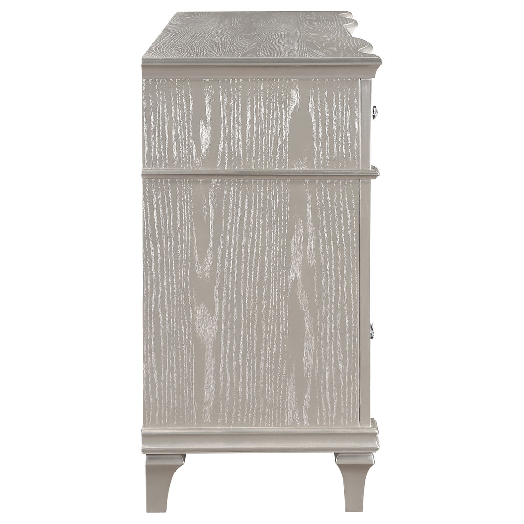 A silver oak finish creates an elegant touch to this glam nine-drawer dresser. Hexagon-shaped knobs and drop bail handles appointed with pearl accents adorn each of the nine spacious drawers for a luxurious look and feel. Keep delicate essentials organized within the grey felt-lined top drawers and garments in the deep bottom drawers. Across the dresser front is a curved facade that sweeps through the drawer fronts and ends at two sparkling column panels. Charming wood molding details along the top and bottom, along with intricate trim, offer a classical flair.